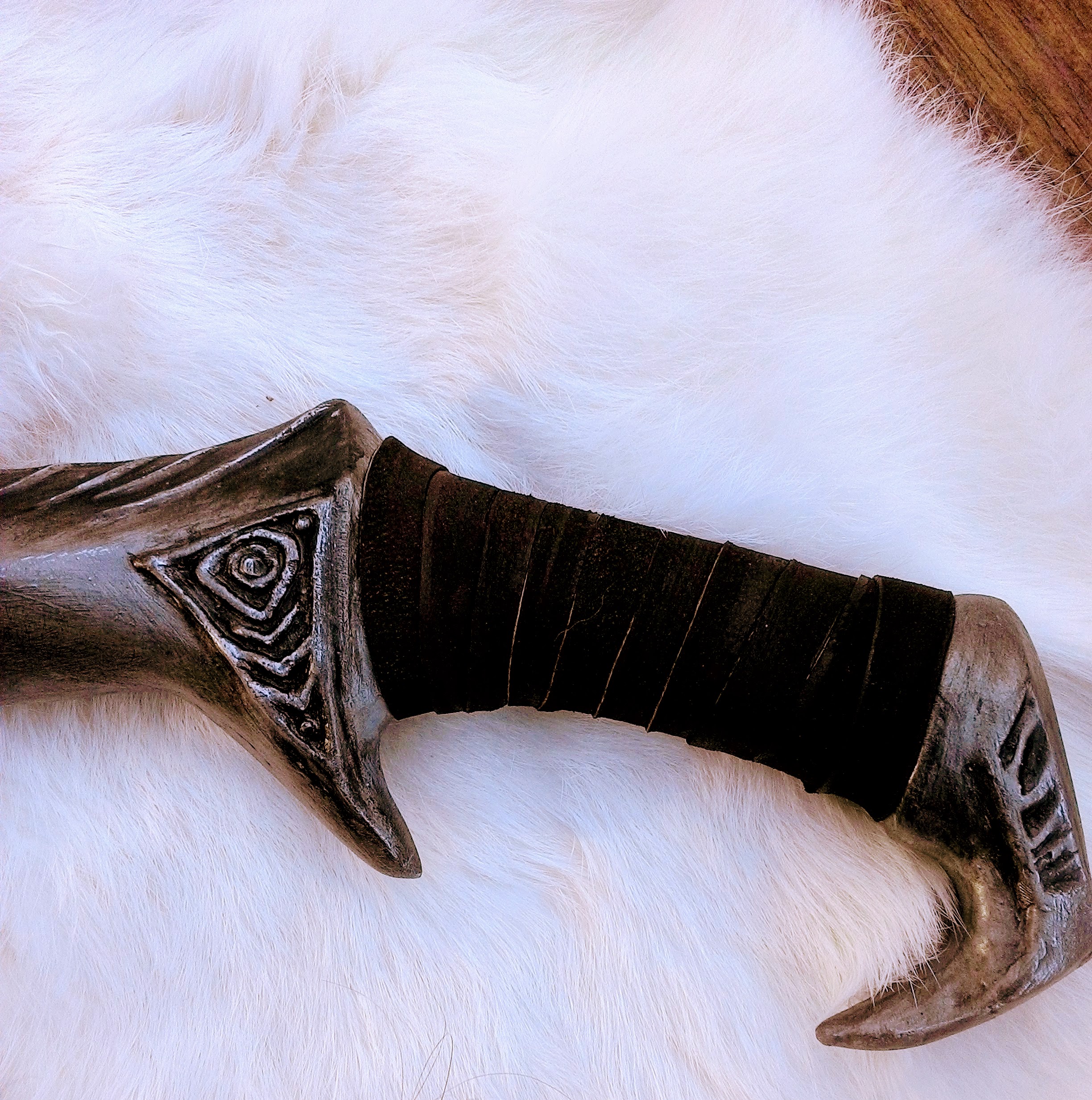 I bought some 2 oz leather on Ebay, and cut that into 1 cm strips. I used 2 part Epoxy to attach one end of the leather to the handle, then I just wrapped it up, and used Epoxy to glue the end of the leather to the handle.