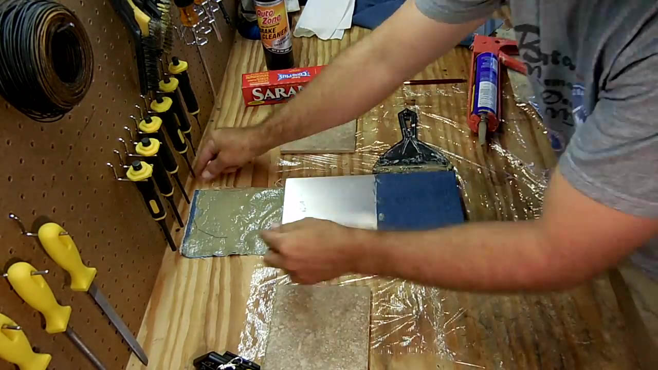 The first step is to create the inner tile denim layer, and in order to that you're going to be impregnating the strip of denim with the construction adhesive. And then once that's complete, you're then going to be adding on top of that the ceramic tiles. Now, it really doesn't have to be done in this order, but this is the way I did it, and it worked perfectly fine. And so the idea behind wrapping the denim around the ceramic tiles is to provide some type of constraining force, or tensile strength around the compressor strength of the tile so that when it tries to break apart or fragment, the tensile forces of the denim is going to work against those factors and the bullet impacting the tile.