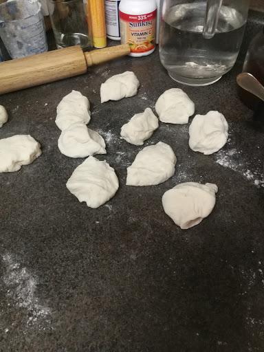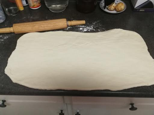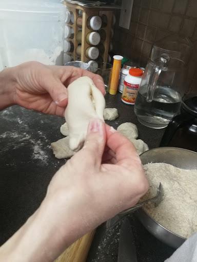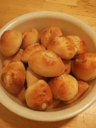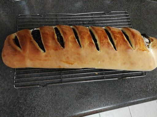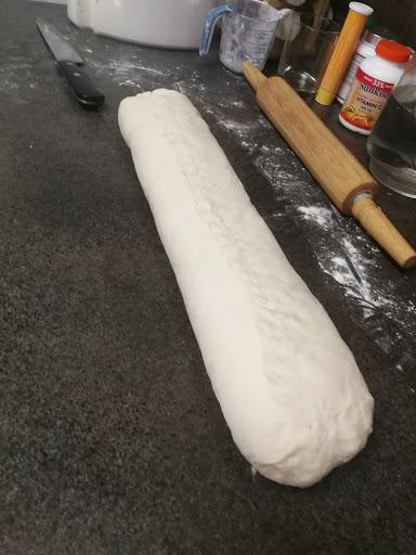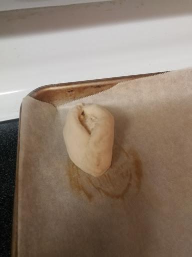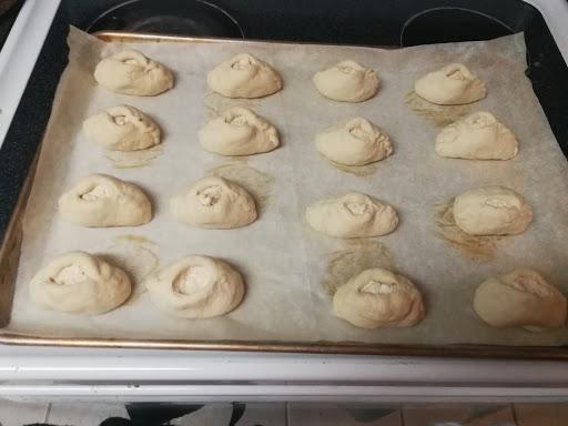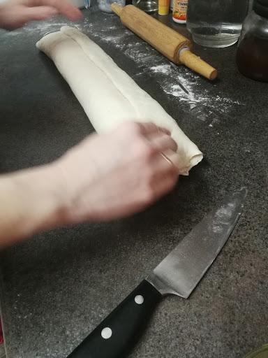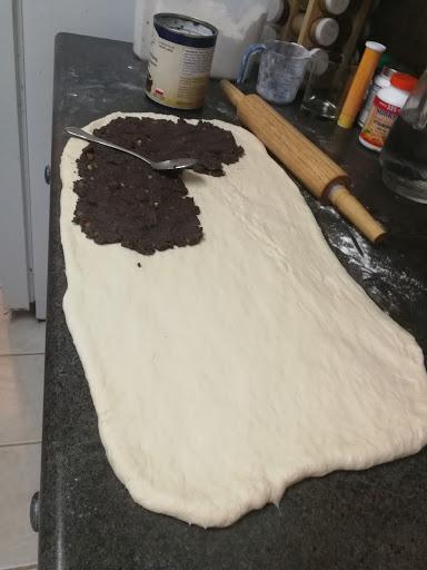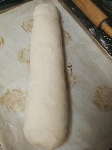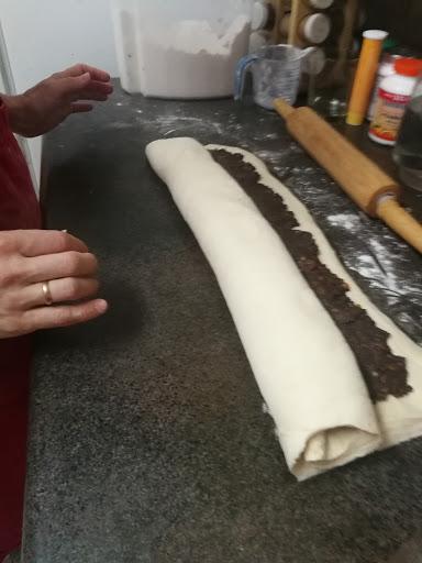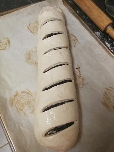 We had a lot of dough leftover, so we used it to make a poppy seed roll. Roll out your dough into a large rectangle with a 1/2cm thickness. Spread out the filling 1/4 cm think and roll it up like a cinnamon roll. Pinch all the seams closed and roll the roll onto a large baking sheet. Make sure it is seam side down. Cut some slits on the top to let steam escape and bake for about 20 minutes.