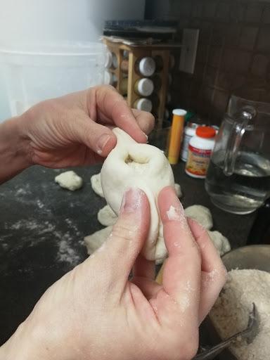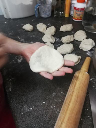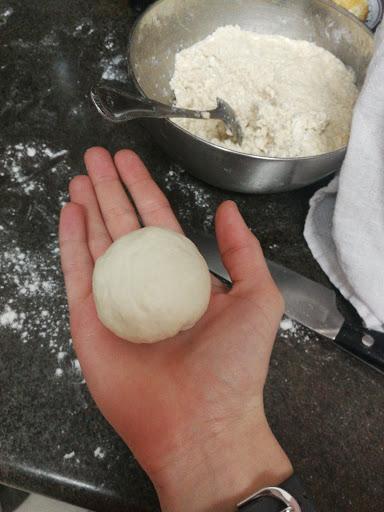 Once the dough has risen again, punch it down and turn out the dough onto a lightly floured surface. Cut off a smaller more manageable chunk to work with and place the rest back into the big bowl and cover with a cloth so it doesn't dry out. Cut chunks a bit smaller than a tennis ball and roll them into spheres.