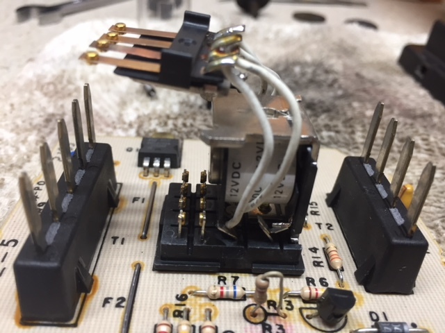 I take the moving arm loose on the relay so it is only supported by the four connecting wires. This allows you to ohm out the base contacts to the board as well as ohming the contact arms through the wires back to the board.