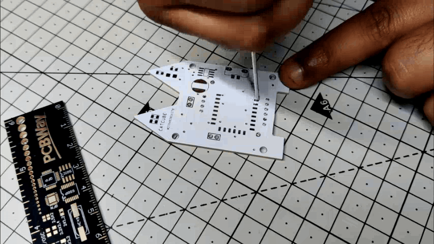 To evaluate how this arrangement will look, we first created a model in Fusion 360. Once the model was complete, we exported the DWG file of the front PCB and loaded it into the PCB Cad software, which provided us with the outline of the PCB with CAT Ears at the top side and paws on the bottom.