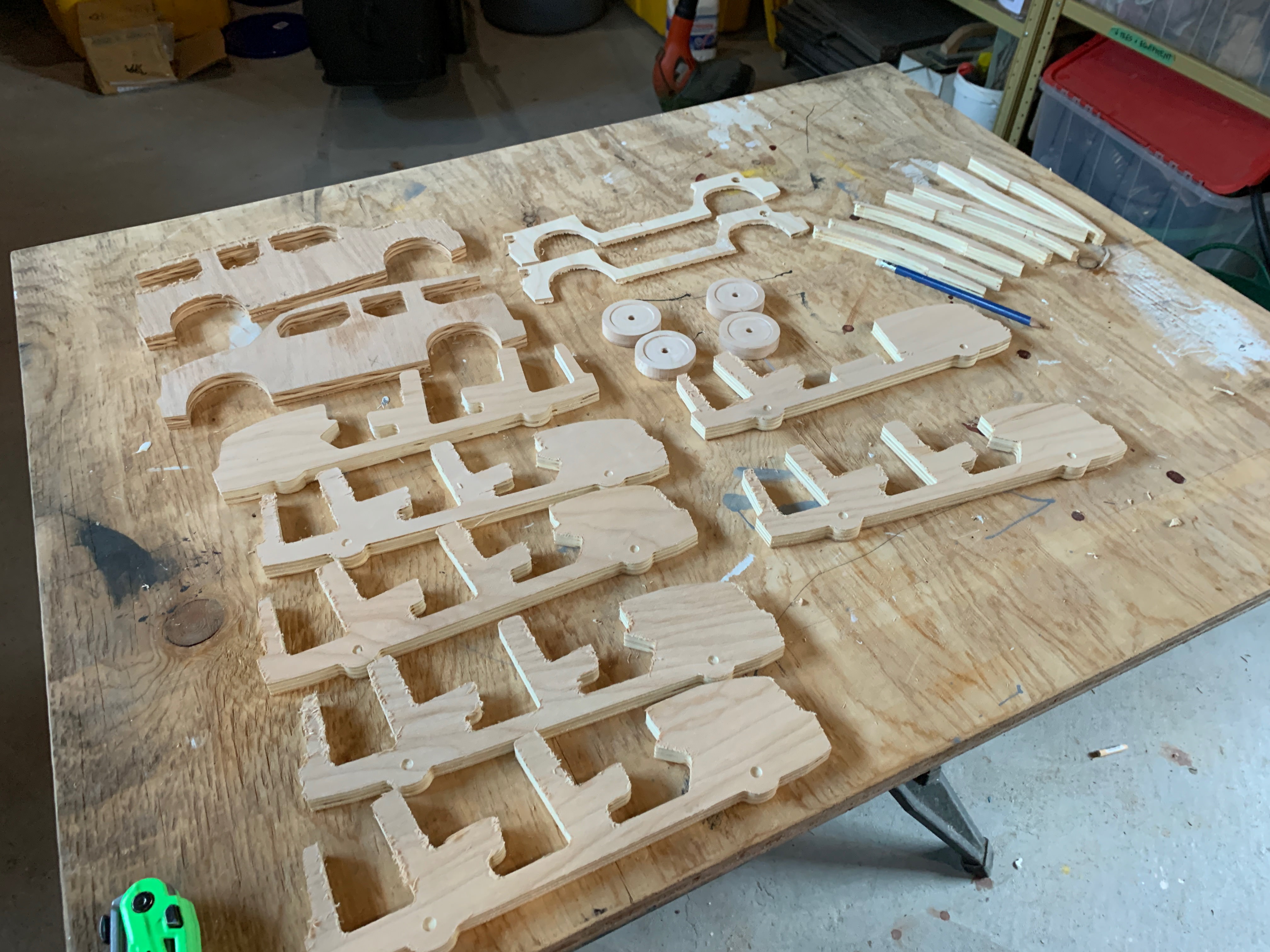 The wheels were cut out of a solid piece of stock, although there’s no reason that it couldn’t be made of the plywood as well. Once I had the wheel holes sized and mounted, I rounded over the edges with some sandpaper and decided to paint the tires black.