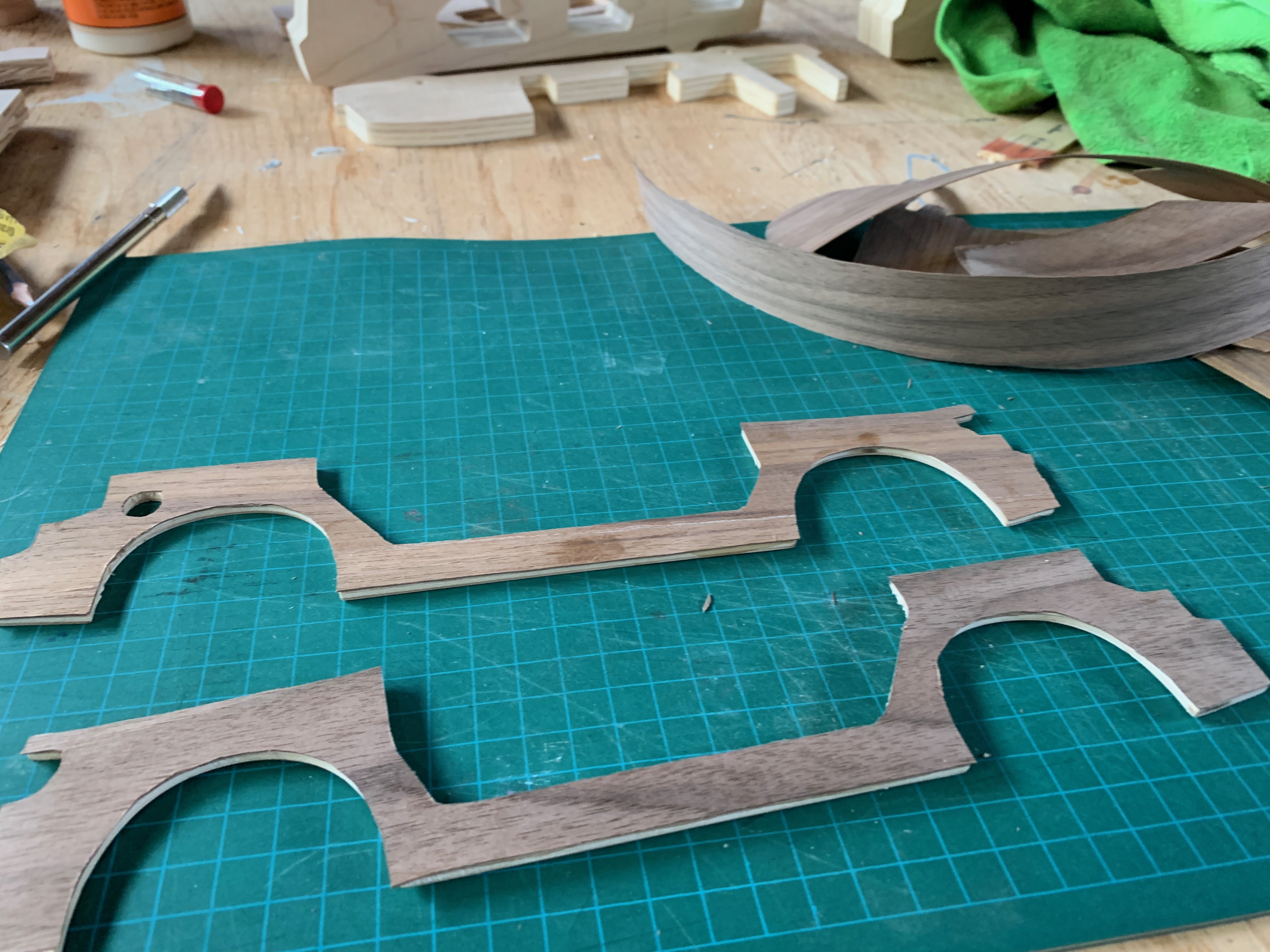 I decided to cover the trim pieces with walnut veneer to create a color contrast on the side of the car. Cut out a piece of veneer big enough to fit over the pieces and glue them to the veneer, making sure that you flip one of the pieces so they are veneers on opposite sides. Because the veneer was curled quite a lot, I sandwiched the glue ups between two pieces of plywood and clamped them together to dry flat. Trim the veneer around the part with a sharp X-Acto knife, and use the blade to carefully trim the veneer flush to the part, and then smooth with the 220 and 400 grit sandpaper.