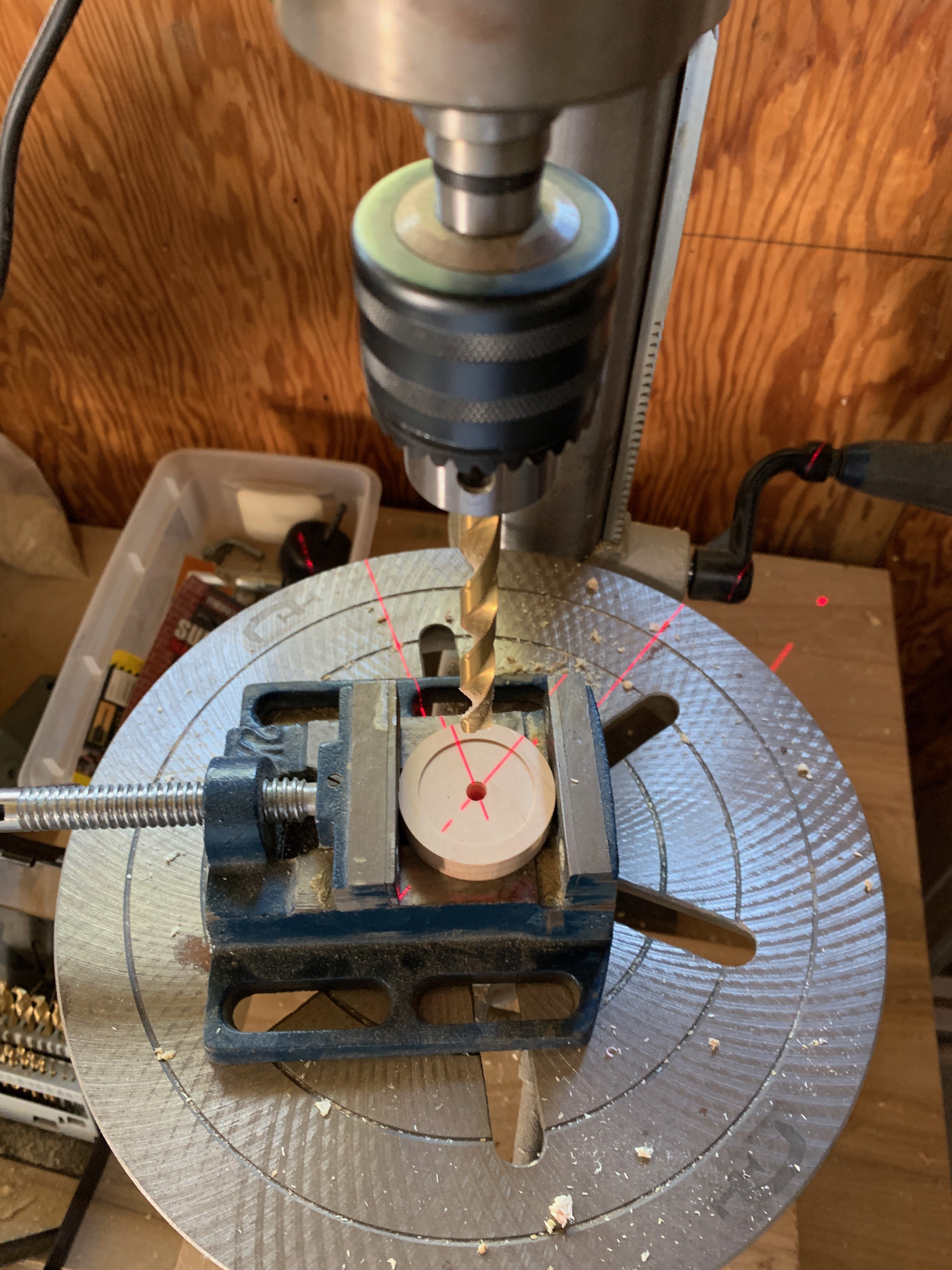 Once the center block is completed, create the holes for the axels using a drill press and a 1/4” bit. It’s much easier doing this when all the layers are together vs trying to line up holes from the individual pieces and you’ll get a smoother hole for the axels. I used the depressions made in the profile as the guide to center the bit.