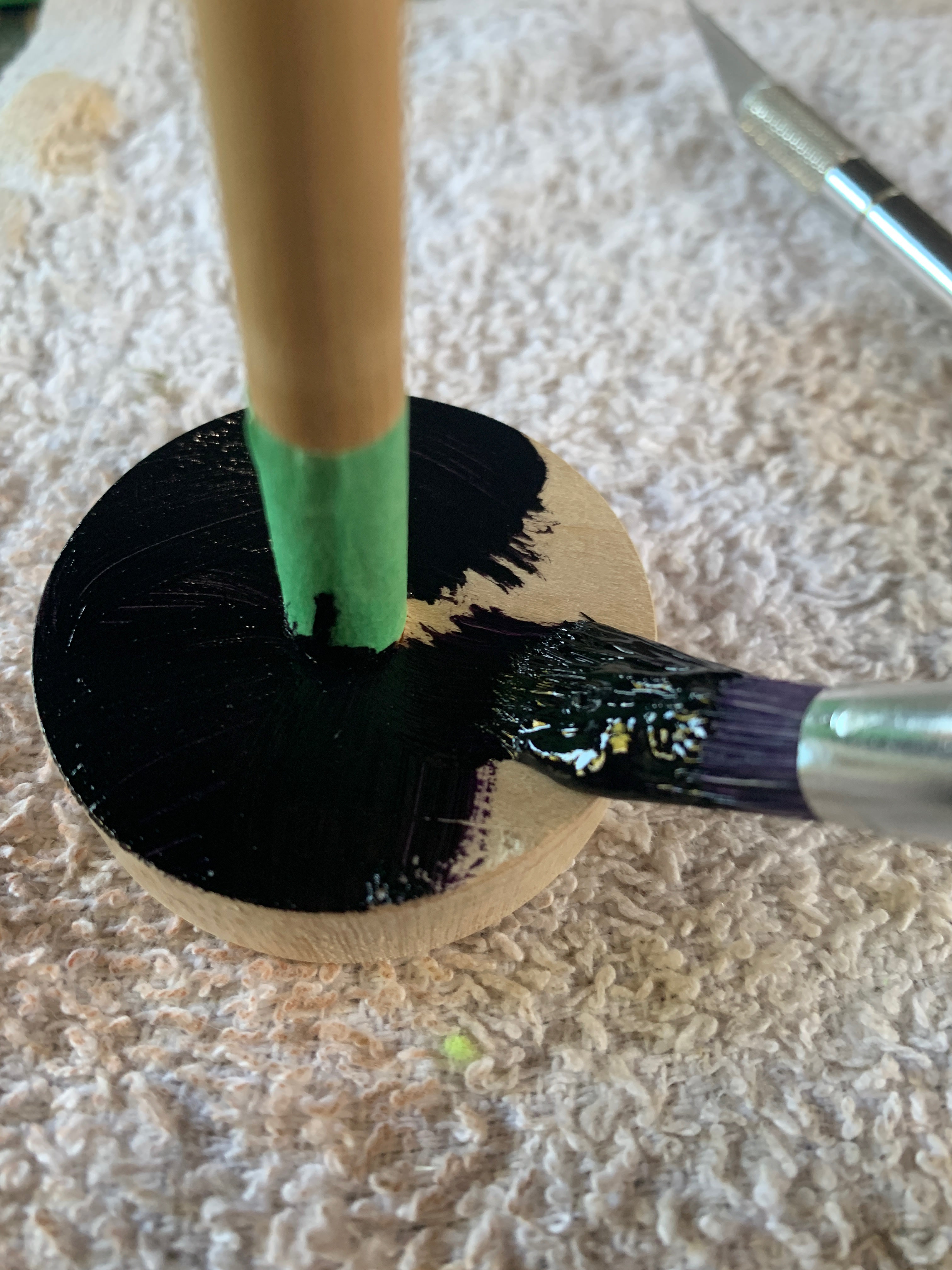 For the paint I just used some artists acrylic that I had laying around, but here’s a top tip: if you want your paint to look deep black, mix in some other color (blue / green / purple) as well. Pure black paint looks great when it’s wet, but can sometimes dry to a color that’s more like a really dark grey. So I mixed in a little purple and it came out great!