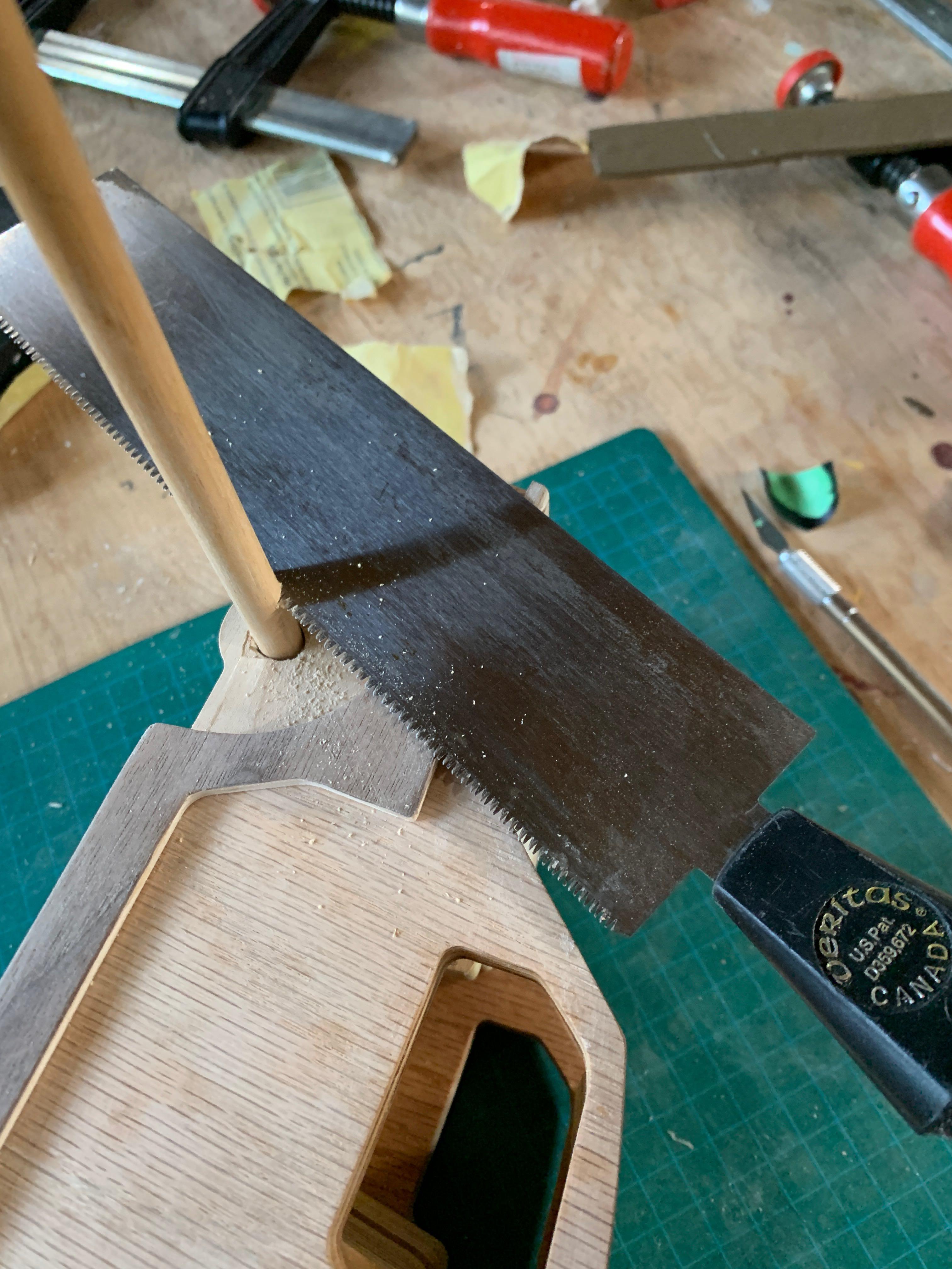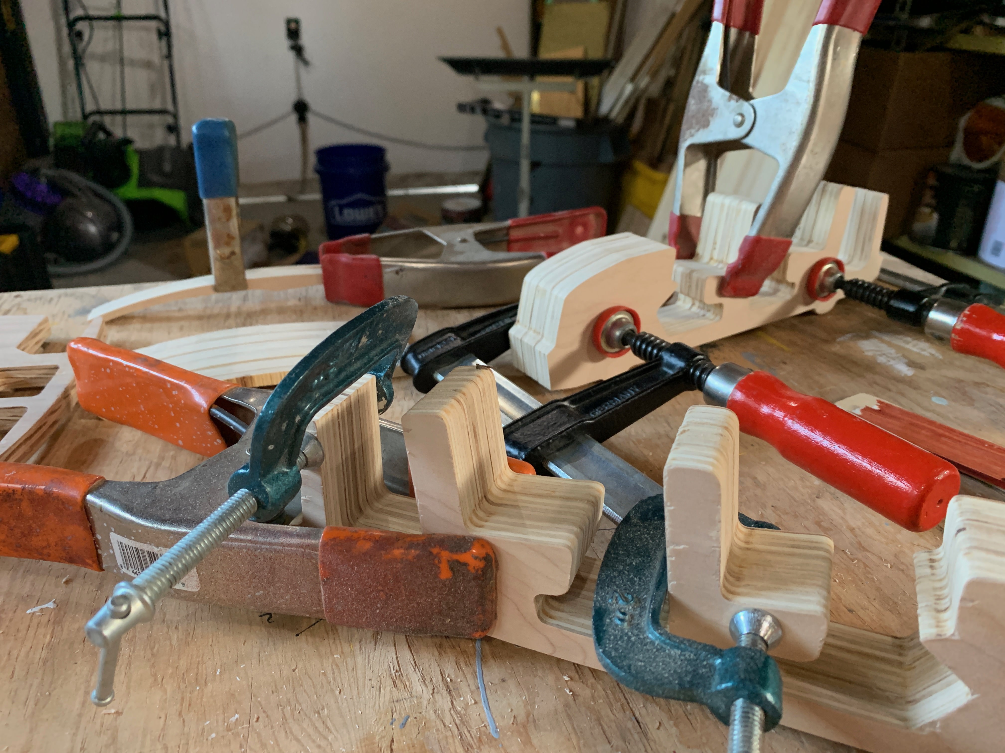 Gluing the pieces together in a staged approach works best and also allow you to do some finishing on the interior surfaces prior to final assembly. I started with the pieces for the roof. When gluing the pieces together, glue a piece at a time. On my first attempt, I had clamped all the pieces together at once and by the time it dried some of the pieces had shifted - it was only by a mm or two but it was enough to make it stand out visually and a real pain to sand. So what I did instead is for each slice, place a thin film of glue on one side and add it to the stack. Move it back and forth a little to help the glue set. The easiest way I found to match the contours is by touch - it’s much easier to tell when they are aligned perfectly. Hold it in place for a minute then add the next slice. Once you have the pieces together and aligned clamp to finish drying.