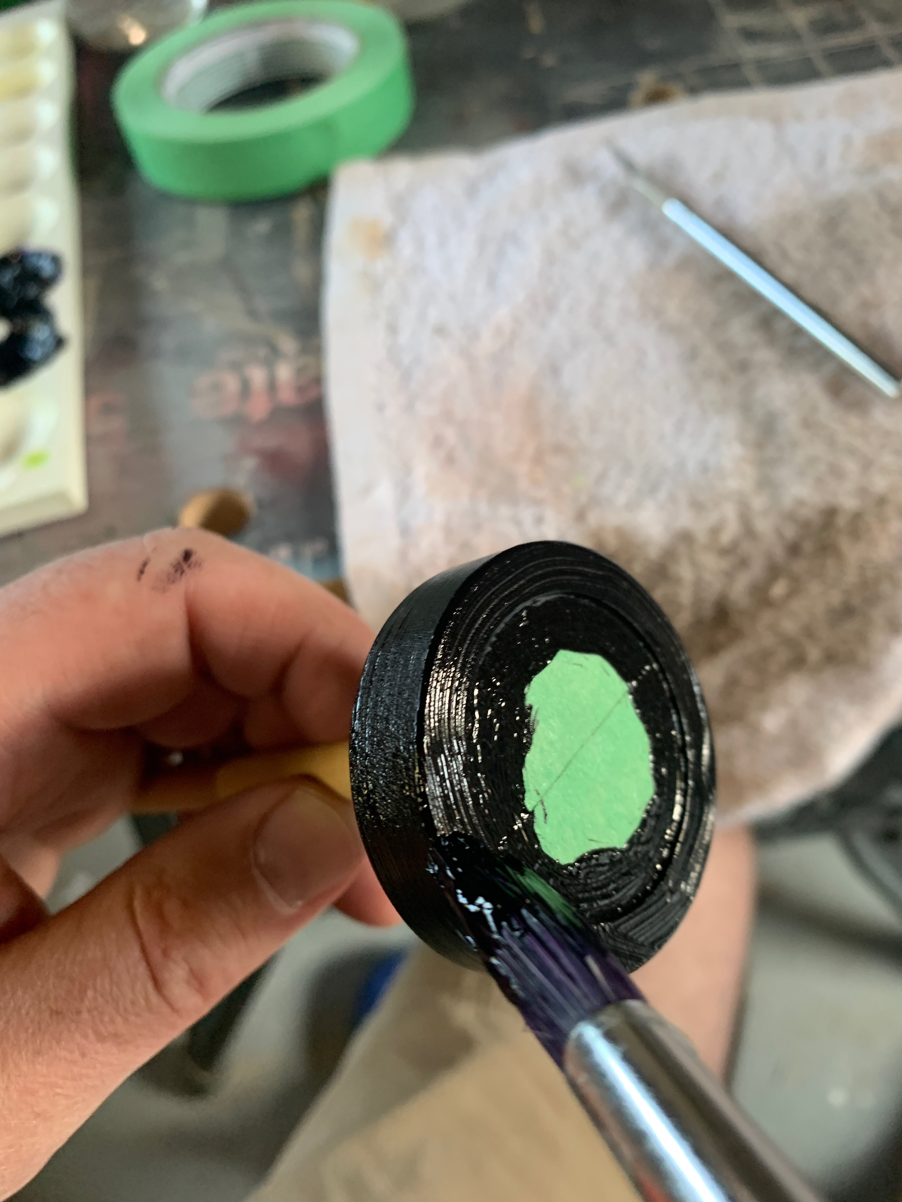 Masking off the face of the wheel with painters tape, I used a sharp knife to trim the tape on the inside corder of the recess, and put some tape around the axel right behind the wheel.