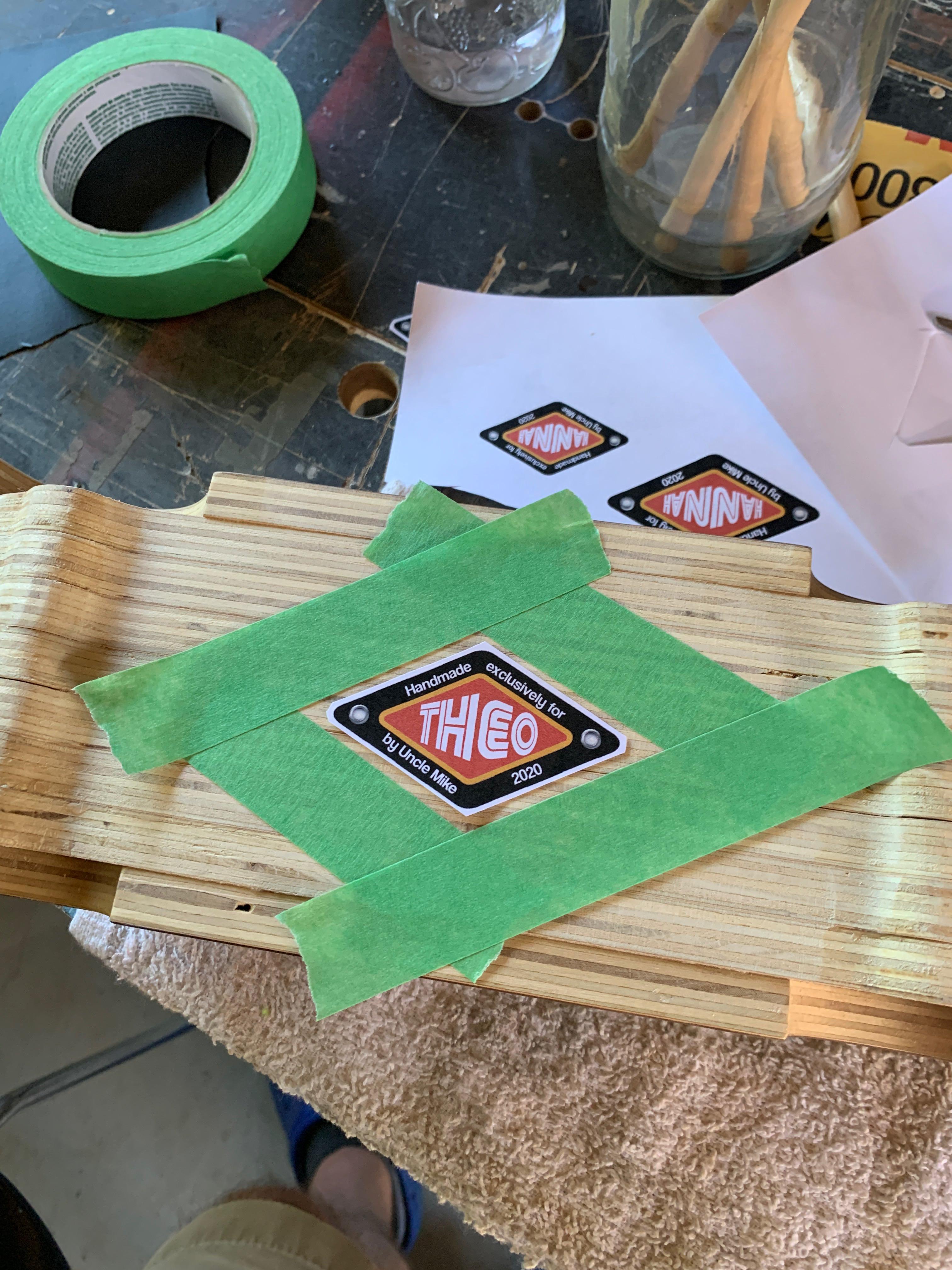 I designed a label in Illustrator and printed it out at various sizes so I could see what was the right scale for the toy. Once I decided on a size and location, I used painters tape to mask out an area slightly larger than the size of the label. Using some Mod Podge® I painted it over the masked area and then centred the label on it and smoothed it out so there were no air bubbles underneath. After that layer dried, I came back and covered the entire are and label with 4 more coats letting it dry between coats. When I removed the tape, it looked like a decal with a clear edge.