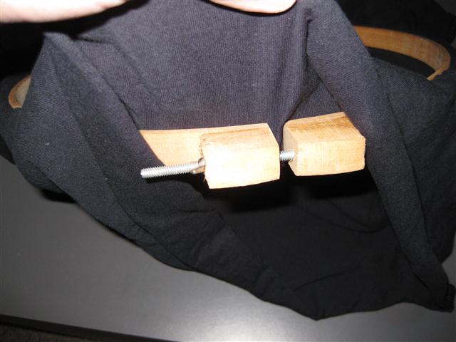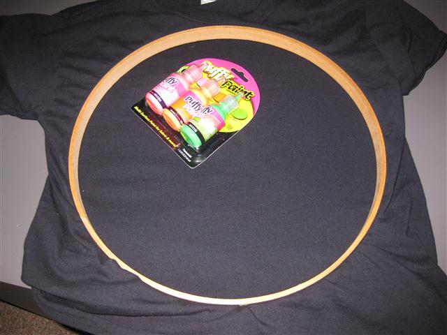 Using the 14 inches outer diameter by ¾ deep closeable hoops (aka Wooden Embroidery Hoop) put the clamp portion inside the shirt.