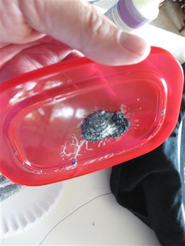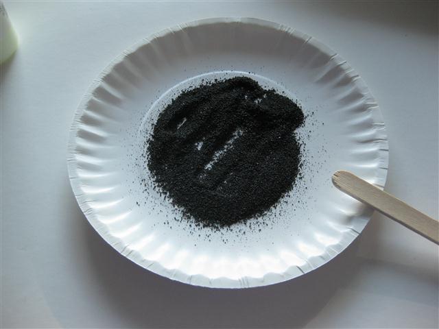 I cut open the Magnetic picture game - Wooly Willy with household scissors, to remove the metal filings (I used three games for the metal mixed). Then I used three squirts of glow in the dark fabric paint.