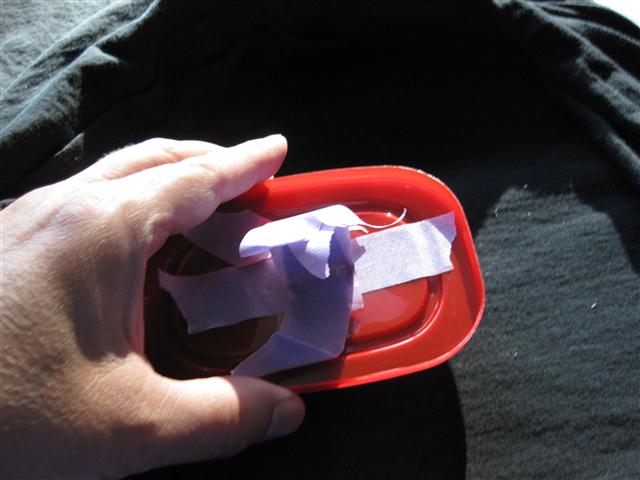 Rare earth magnet wrapped in easy removal tape. I did not want any chance of the magnetic dust to get to the magnet. I thought that it would be near impossible to remove. So, I also used a piece of plastic from a recycled butter tub.