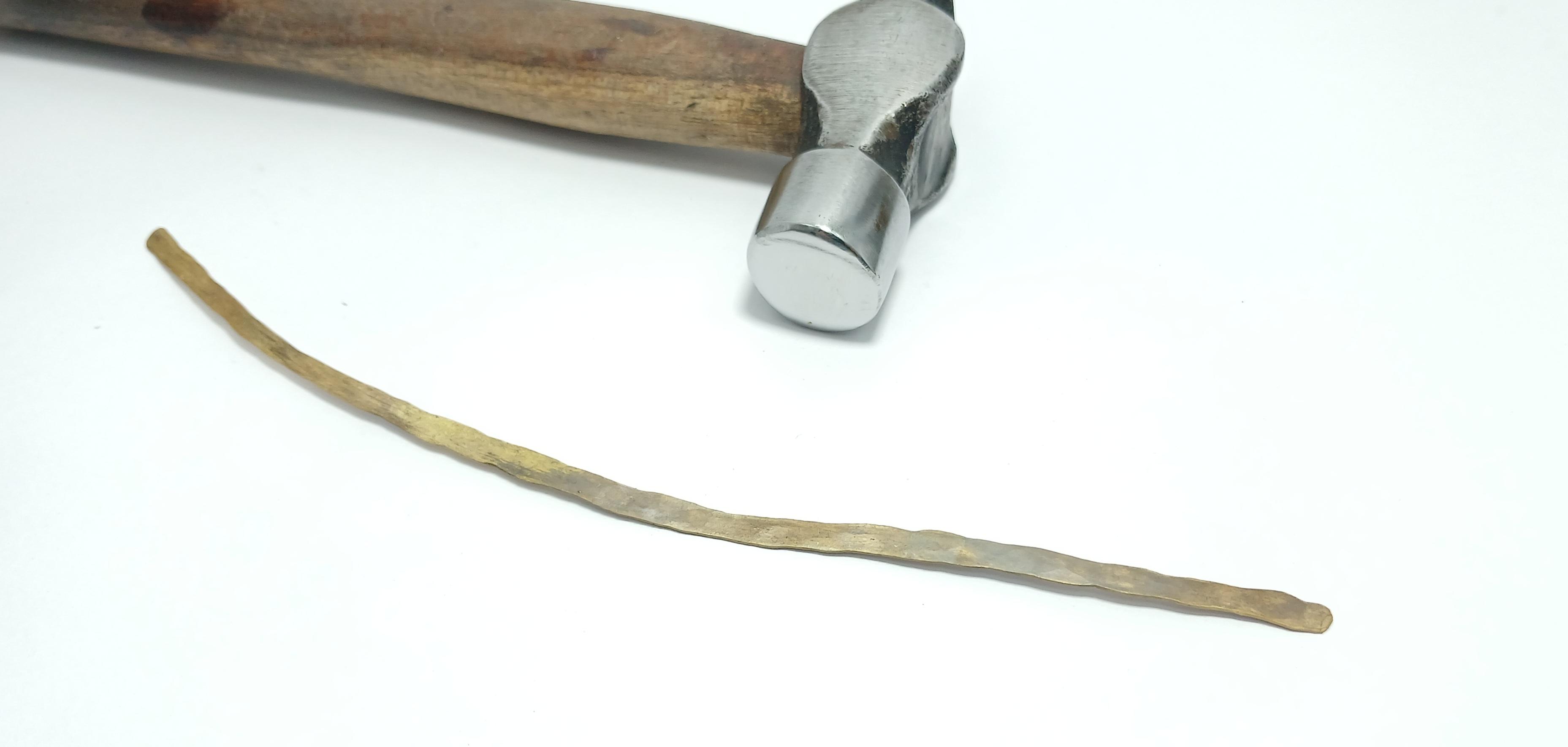 Step two is to reheat the rod and then place it on its side and gently hammer down the side to end up with a uniform bar that's approximately 3mm by 1mm. Repeat until you are left with a mostly uniform bar as shown bellow.