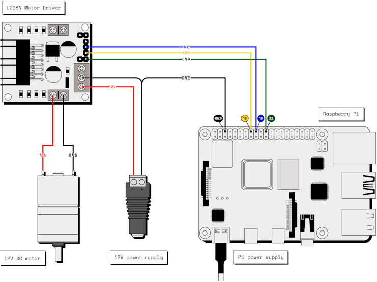 The Raspberry Pi and the 12V power supply share the same GND on the L298N motor driver. The Raspberry Pi is powered by its own 5V power cable.