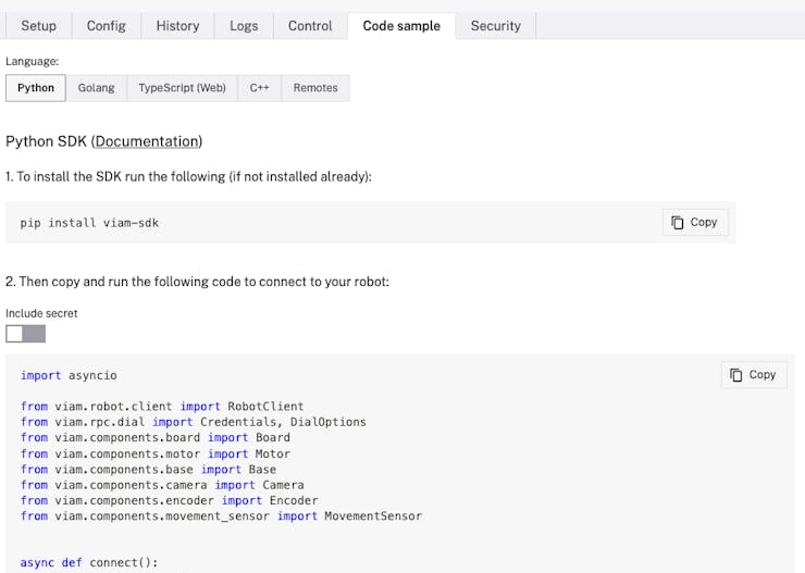 On the Viam app, select the Code sample tab and set Python as the language.