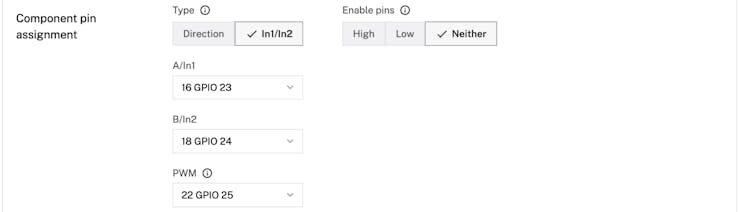 - During wiring, you connected pins on the Pi to two ports called IN1 and IN2, and a third pin to ENA. When you toggle the In1/In2 motor type, the UI opens three dropdown fields below it. Use these to specify the board pins that each motor driver pin is wired to: