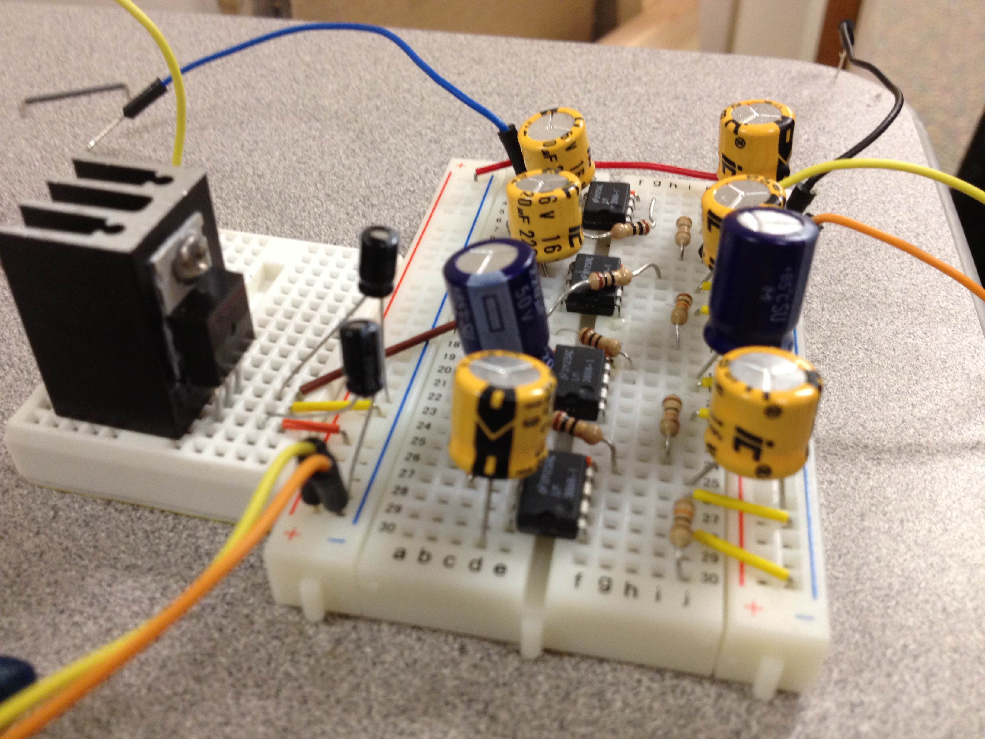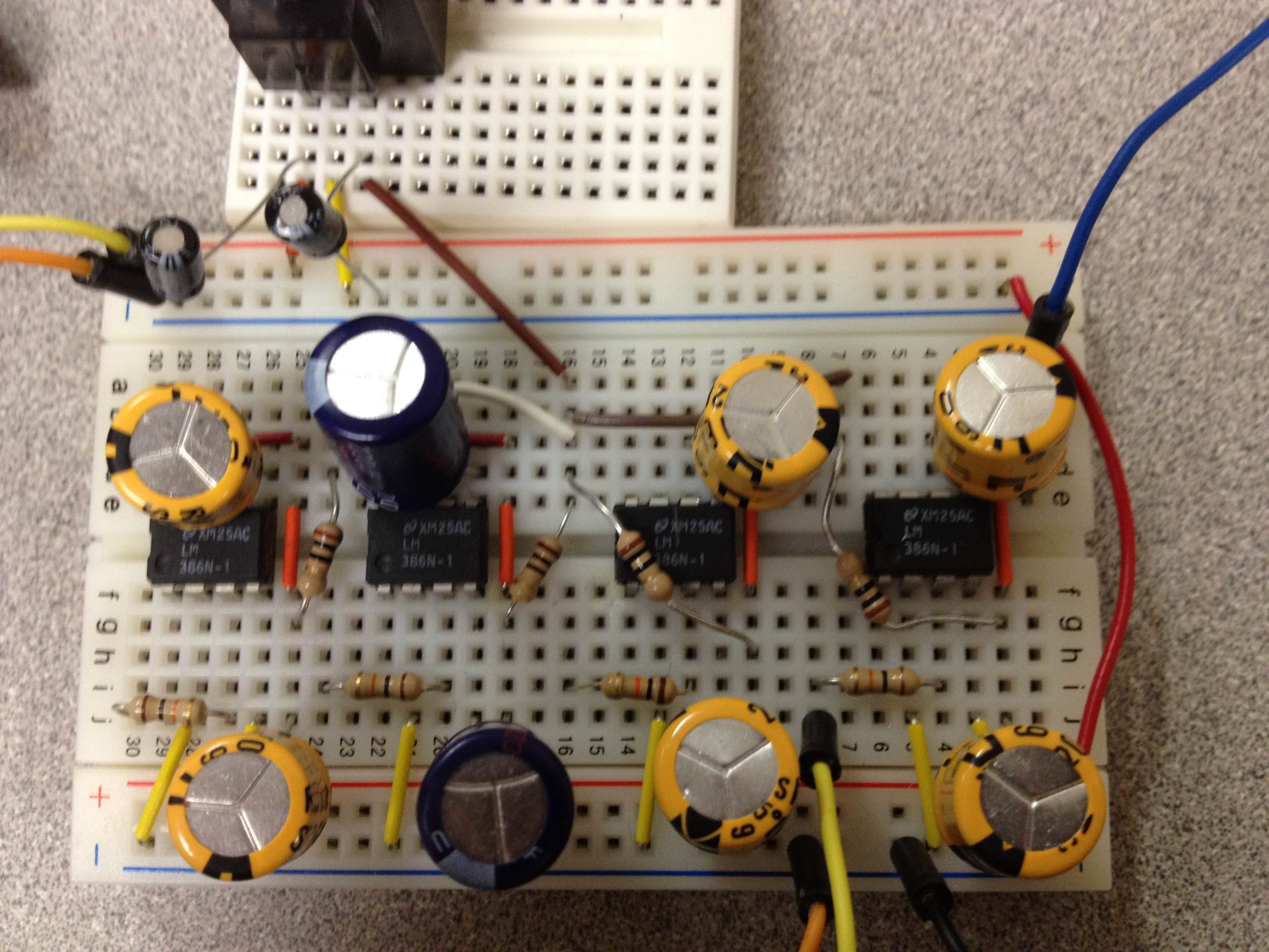 We used the LM386 speaker amplifiers to amplify our butterfly speakers. We followed this instructable to create it 4 audio amplifiers since we ended up using 4 speakers. These amps are hooked up in parallel. The last image also shows a schematic of how an individual amp can be set up.