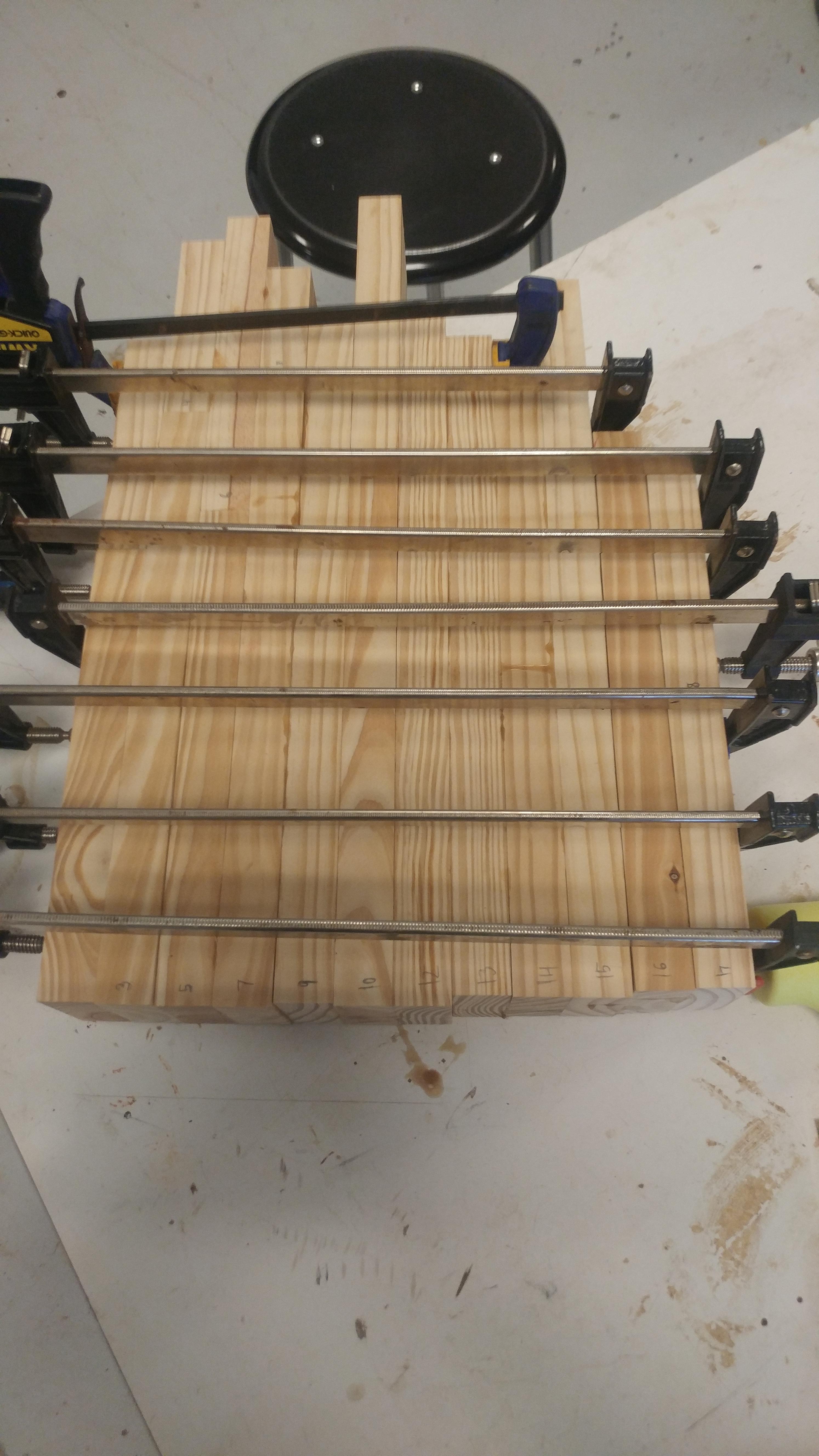 This is your easiest step. Get your boards from the supplies, and stack them next to each other to about the width you're going to want the body of the guitar. The gluing is the hardest and most time-consuming, irritating part of this step. It may take a few days to complete, because it may have to be done in two or more steps. Once the width has been determined, you have to glue and clamp the boards together. The reason this usually has to be done in more than one step is because the first time, after a certain height (3-4 boards) the clamps become less effective at holding together and just make them slide around. So, do it in layers of 3-4 boards, then glue and clamp the whole thing after the first layers dry.