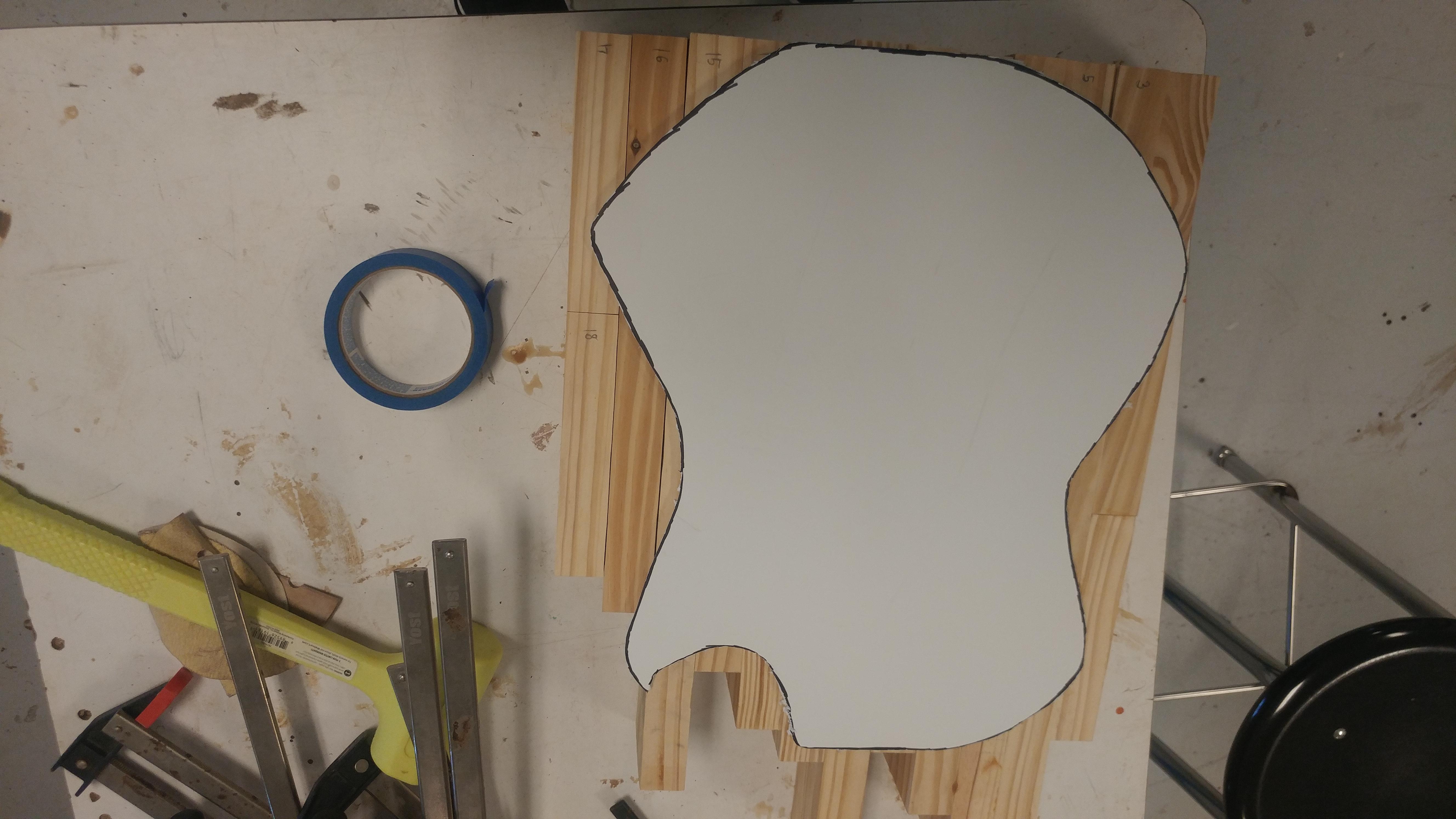 This is where the fun begins. Center and tape the template to the dry glued boards and get the sharpie again. Outline your template. Leave the template attached, and use the bandsaw to cut the body. (Relief cuts will be needed for hand cutouts at the top of the body)