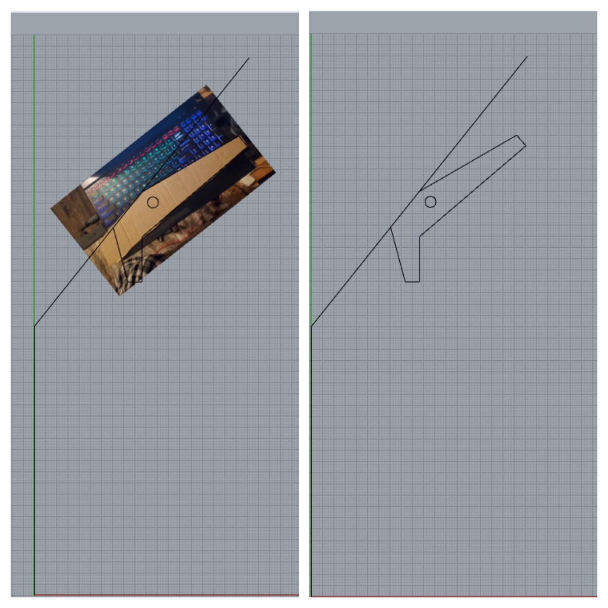 I then took the design process into Rhino, my preferred modeling program. I start with adding the line work that illustrates the pitch of the wall behind the couch. Then, uploading an image of the cardboard template, I sketched out the shape and refined it. See image 3.