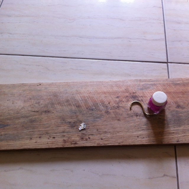 First sand your wood plank and drill 2 large holes, not all the way through. Now nail your hanging hooks.