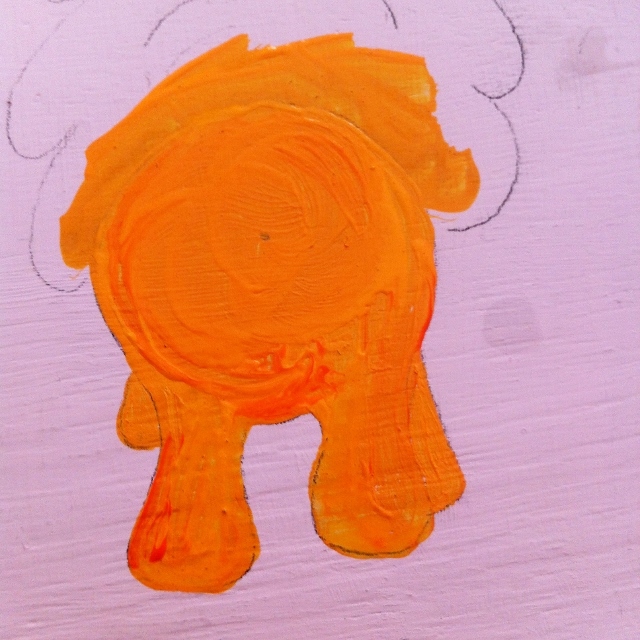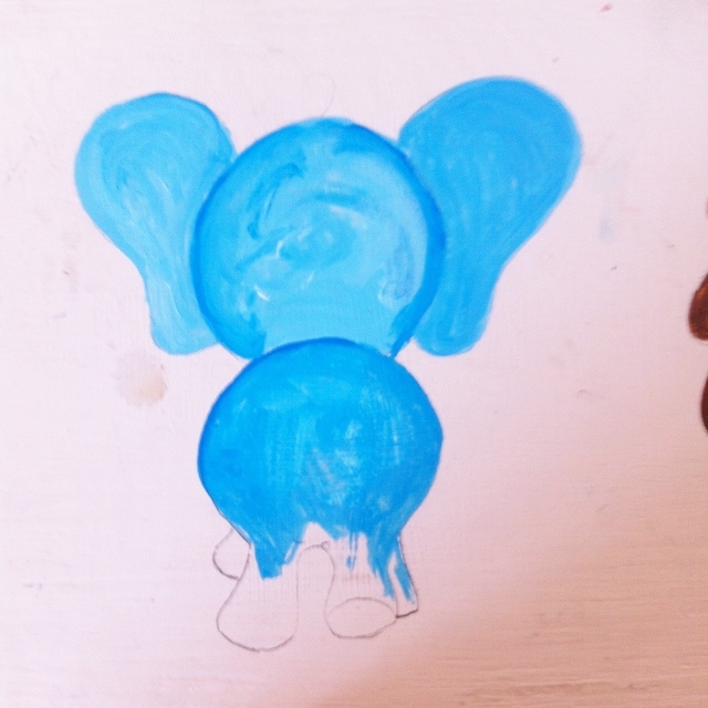 The elephant was painted all blue with the outline done in a darker blue. I drew the elephant's hair with a thin black marker in the later steps.