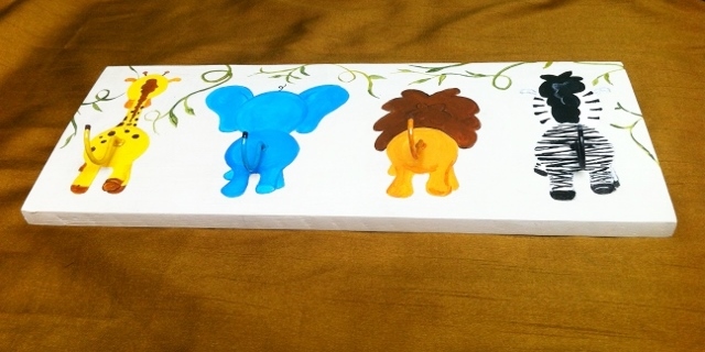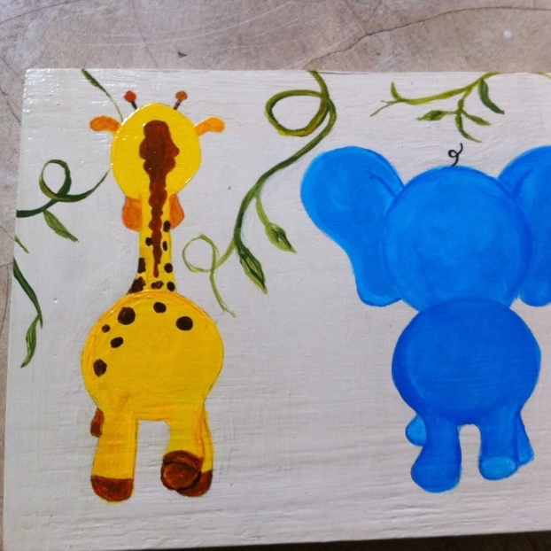 As it was a jungle theme, I painted some vines and leaves. It is all all painted now minus the tails. I gave the background some touch ups because I had gone out of the line a bit. Let your board dry.