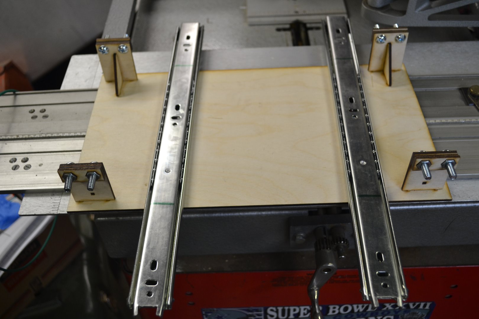 I started to drill and bolt the base plate, drawer slides and platform, but many alignment issues kept coming up. I reverted to 5 minute epoxy, aligned and clamped until it dried.