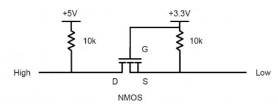 Similarly, when LOW is logic1, then Vgs (gate-source voltage) will be 0 and so the transistor will be inactive pulling the HIGH pin to +5V. When LOW is logic0, the gate voltage is again higher than the source voltage, and the HIGH pin is pulled down.