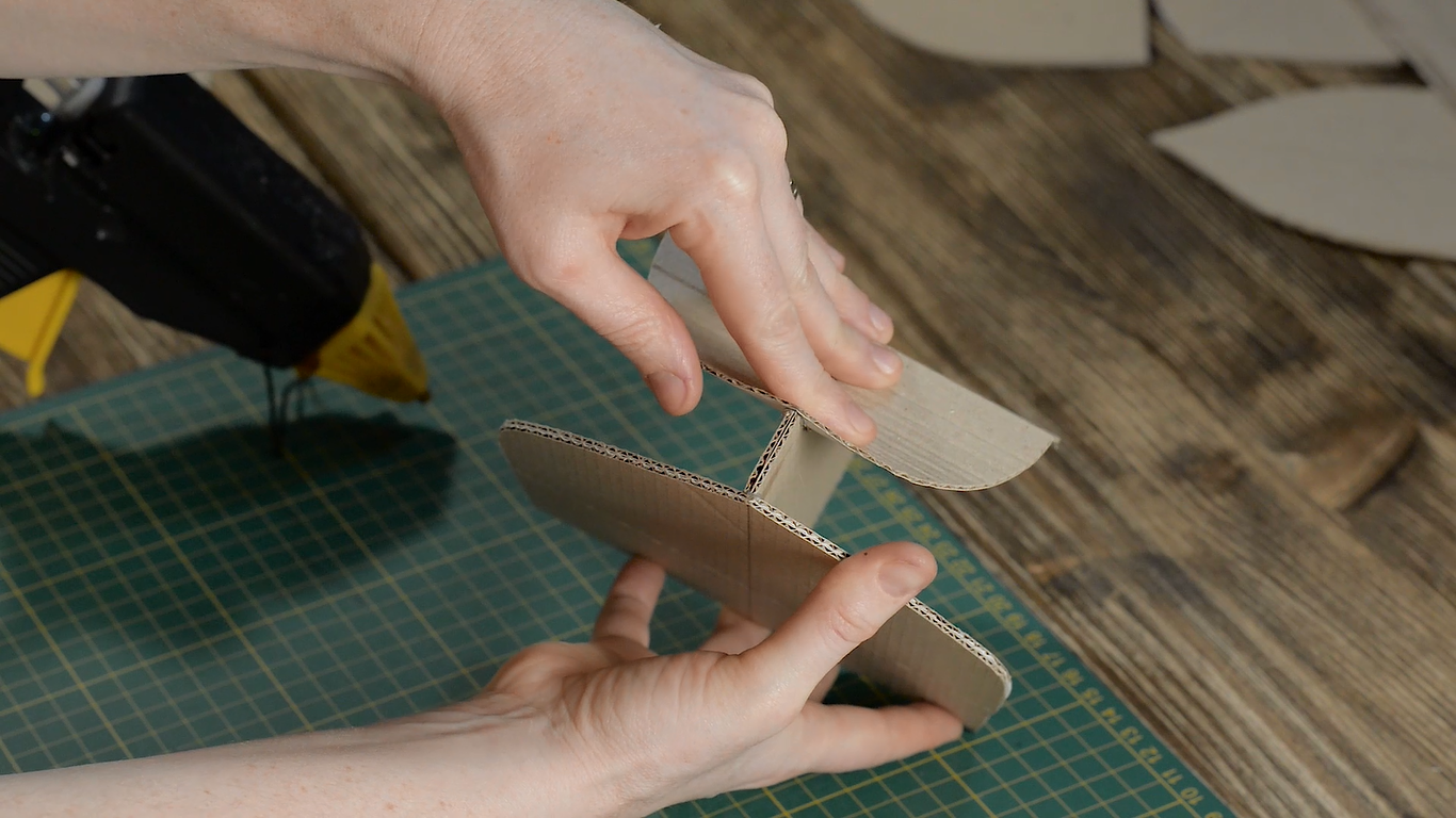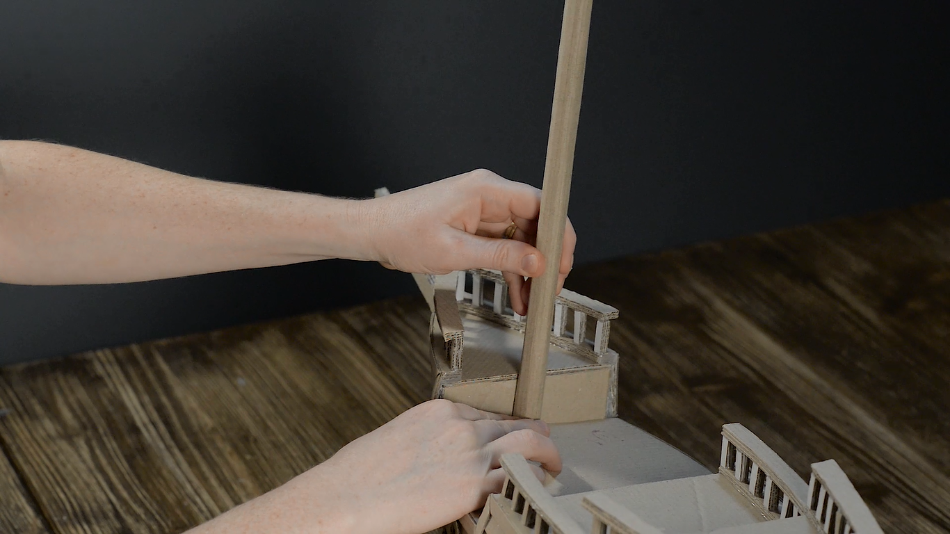 Gluing the pieces together should be easy if you follow the first picture with all the patterns along with the video. Basically the colored 1, 2, 3, 4, 5 pieces are glued to the brown A, B, C, D, E pieces and sit on top of the orange piece. The green a, b, c, d pieces are the deck and sit on top of everything. Make sure to glue the deck horizontally.