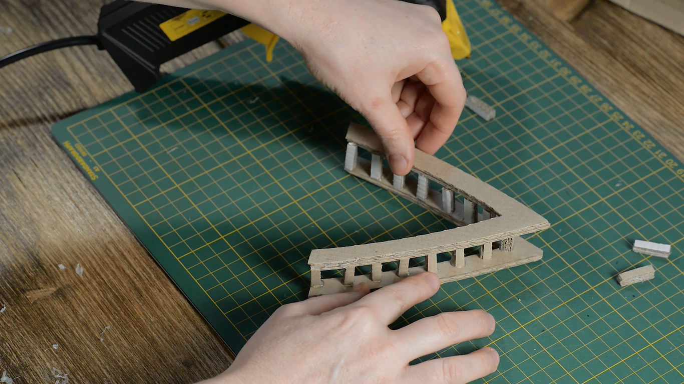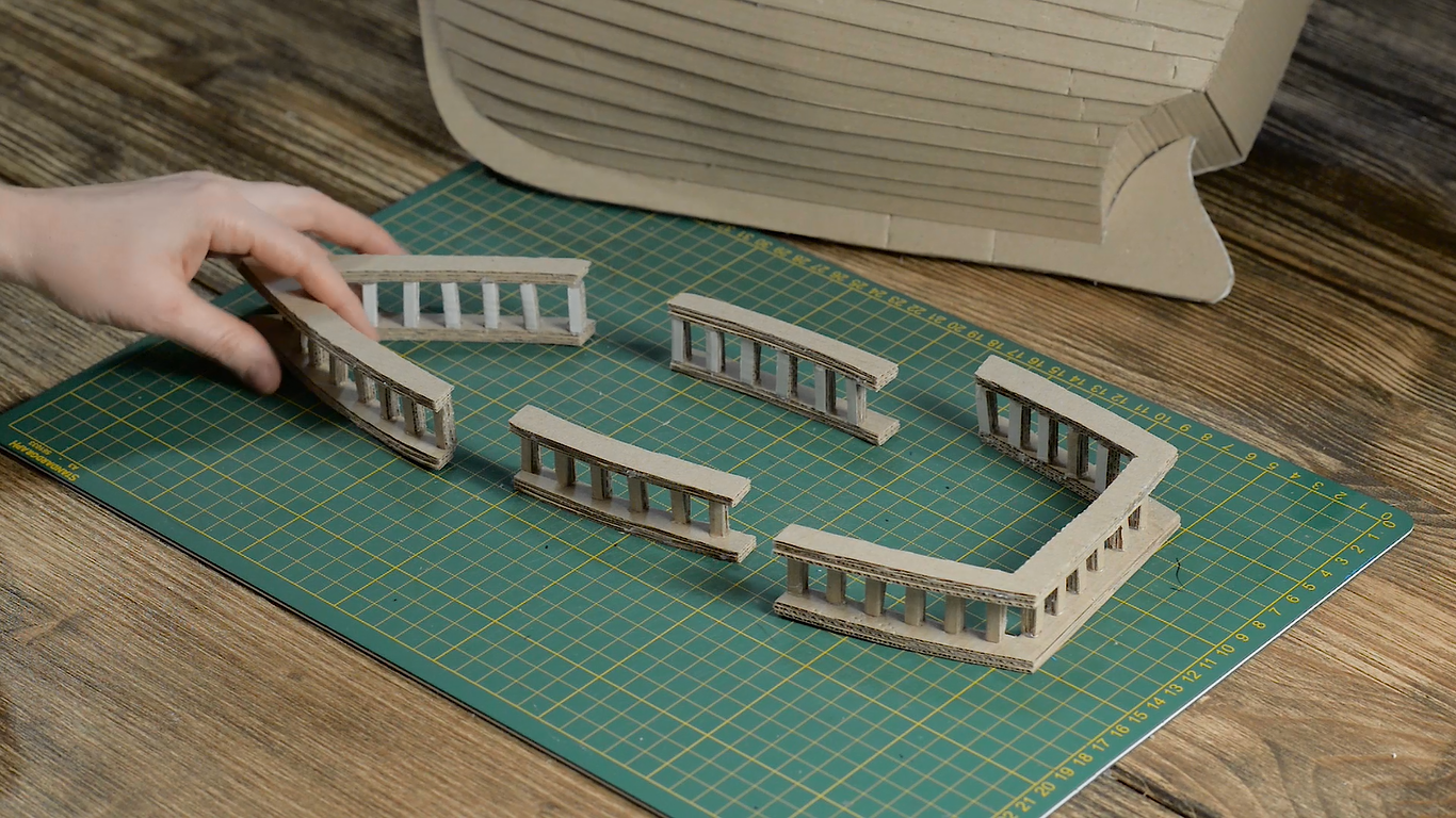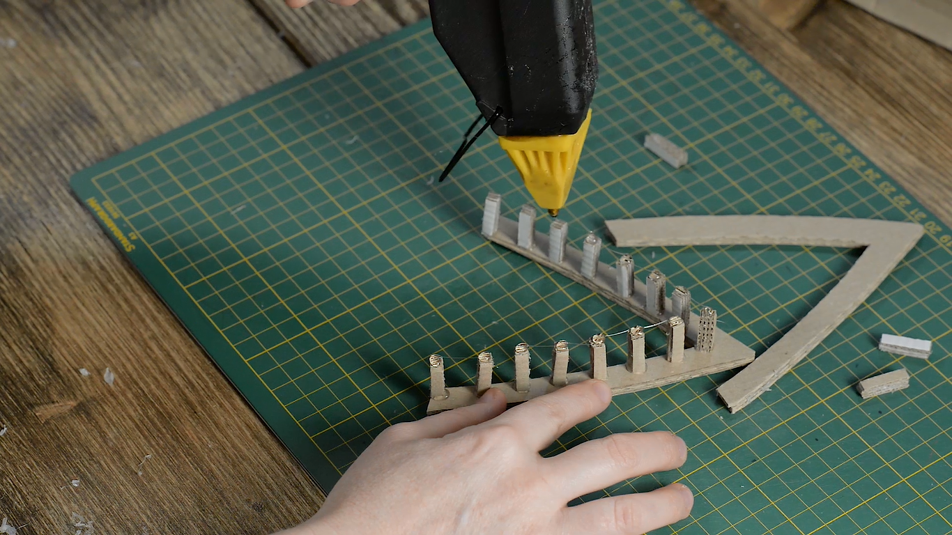 Using the green patterns a, b and d, I outlined the railing top view. You can make wider, thicker or thinner. Mine was 15 mm wide and 6 mm thick. I made the pillars gluing 3 small 30x5 mm cardboard pieces together.