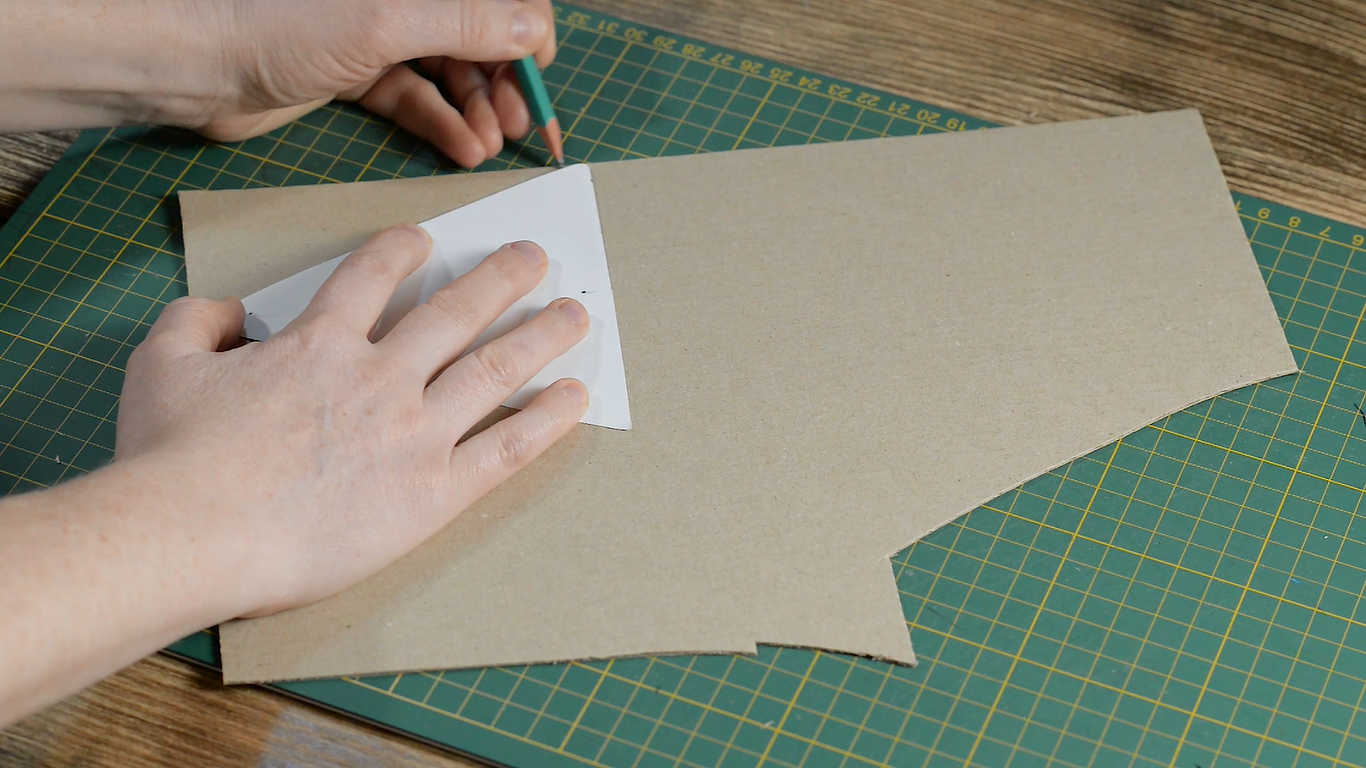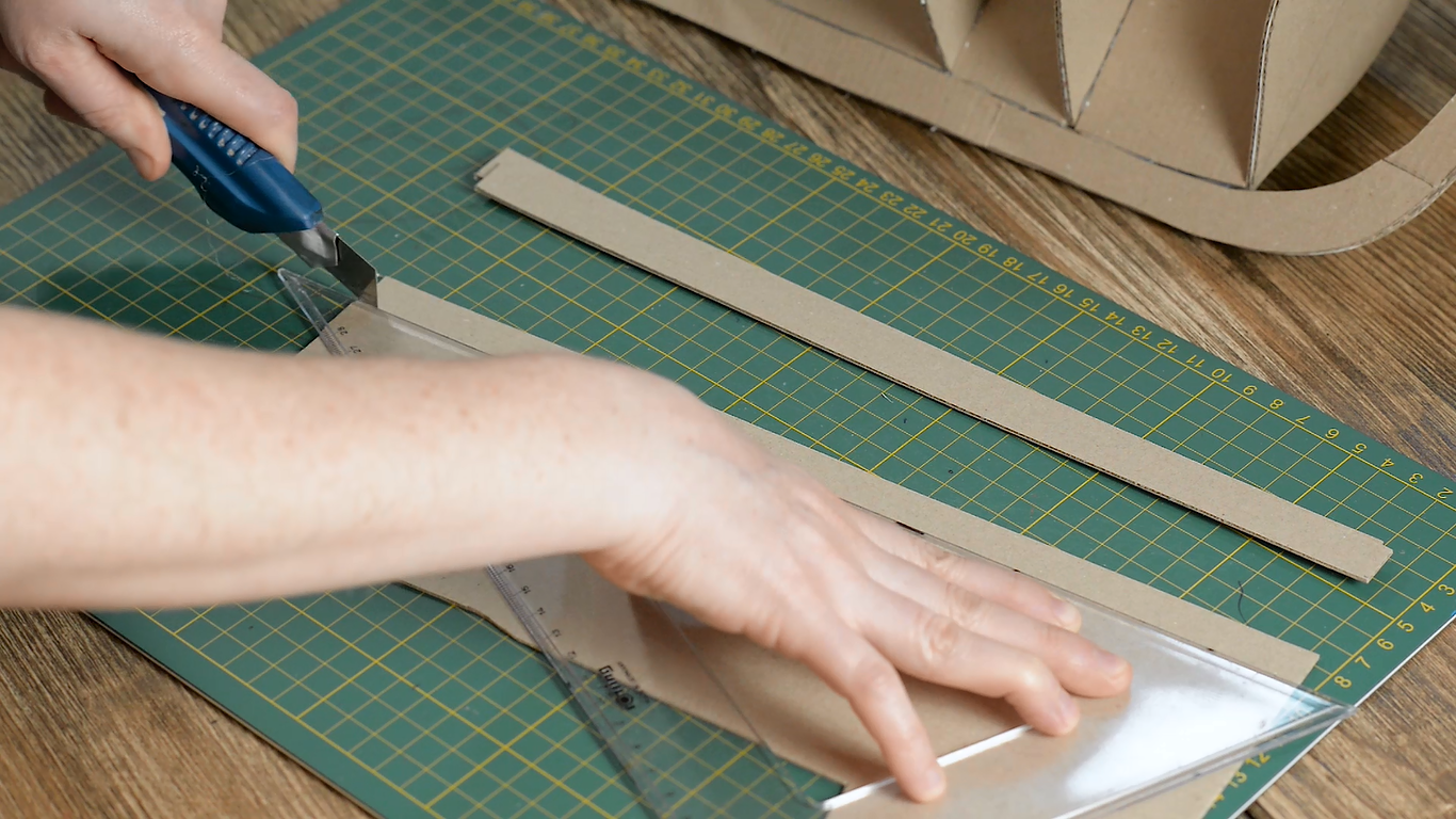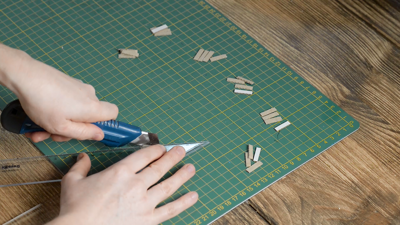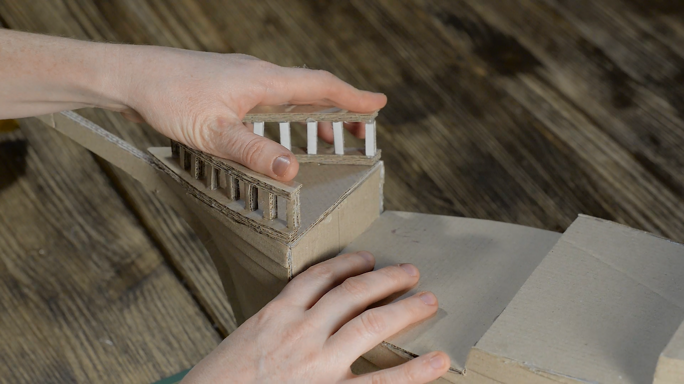 Using the green patterns a, b and d, I outlined the railing top view. You can make wider, thicker or thinner. Mine was 15 mm wide and 6 mm thick. I made the pillars gluing 3 small 30x5 mm cardboard pieces together.