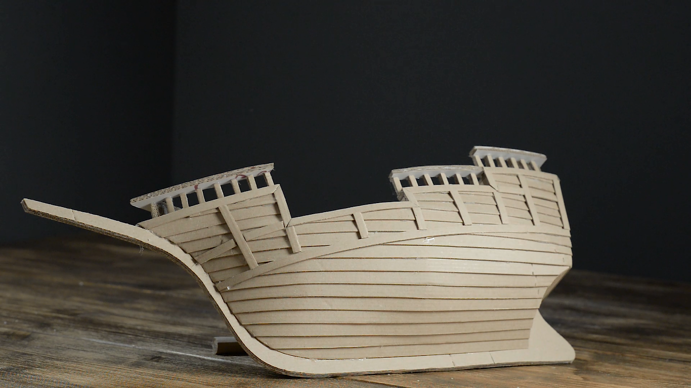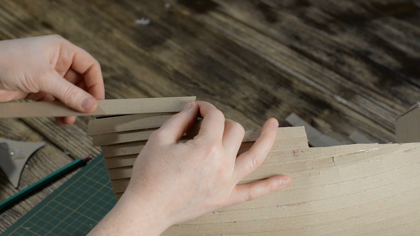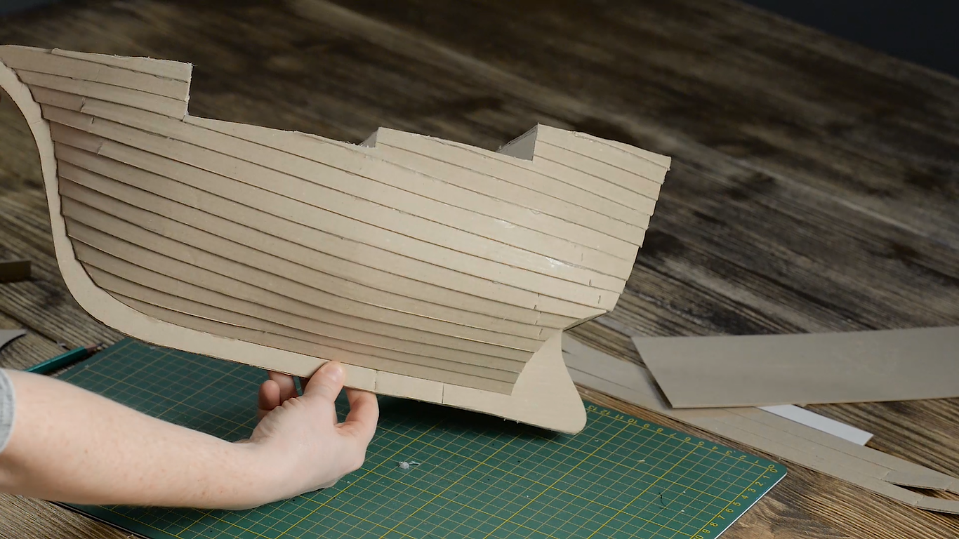 I made some long 15 mm stripes of the same 2 mm pizza boxes cardboard and started gluing them to the framework. I started from the bottom of the ship and worked my way up. I overlaid each piece over the one before just a little bit.