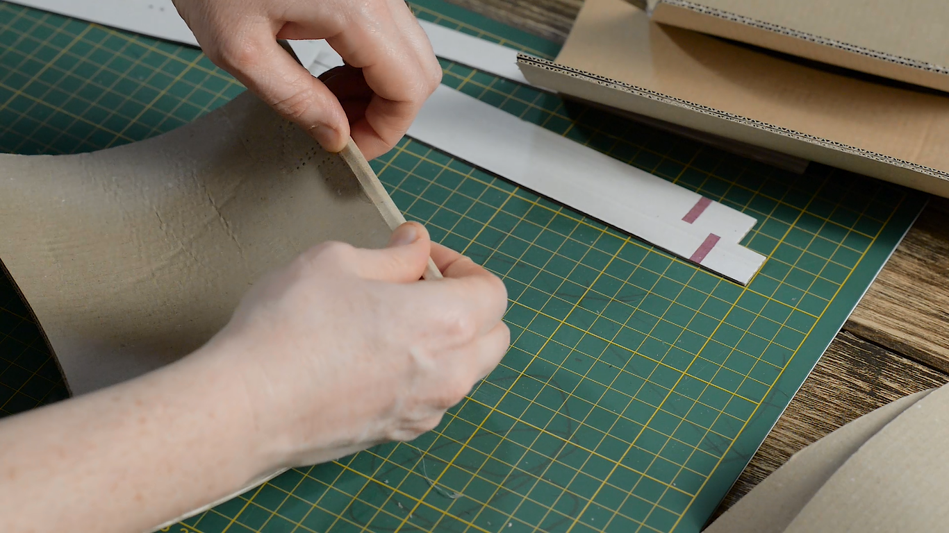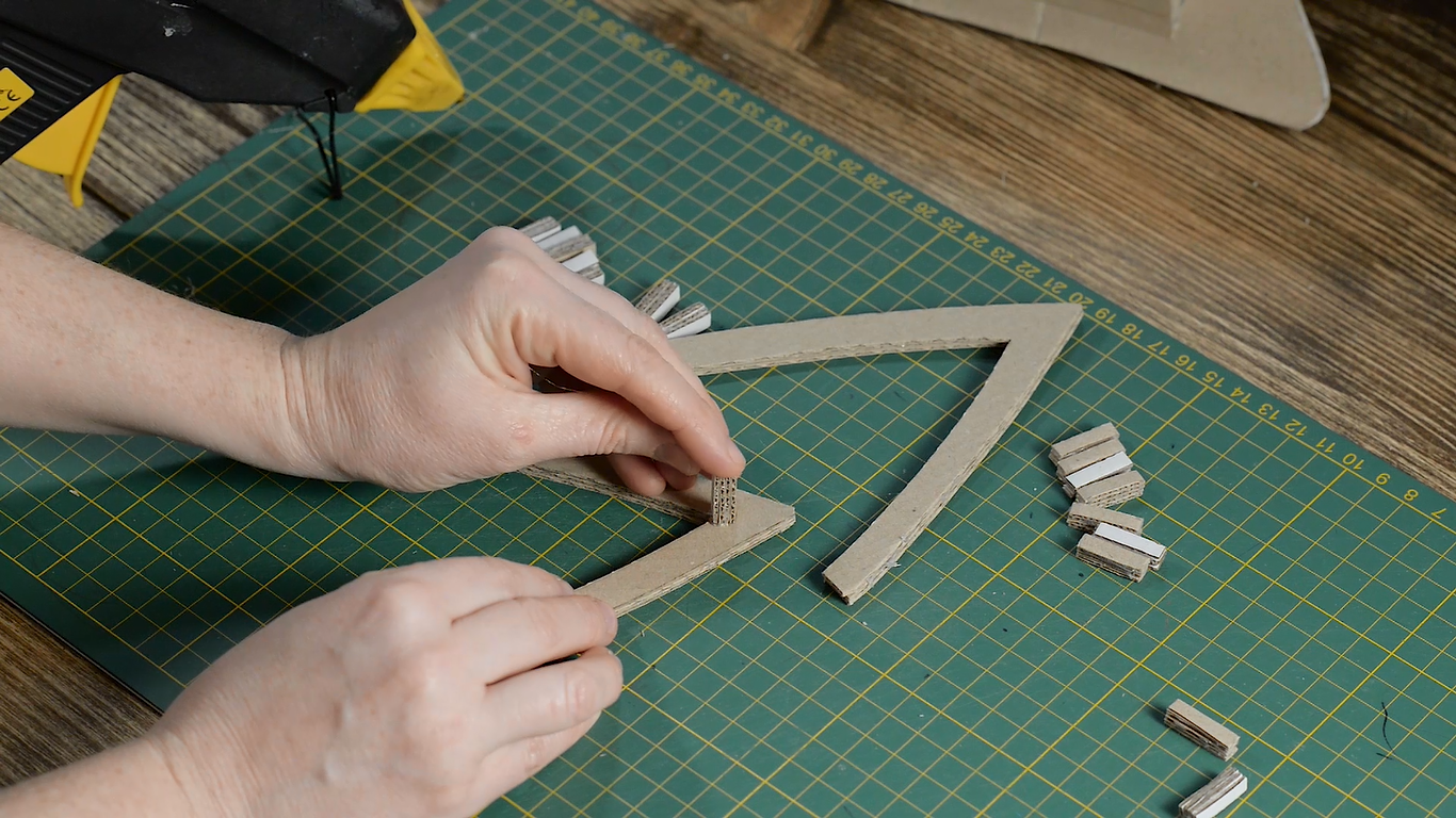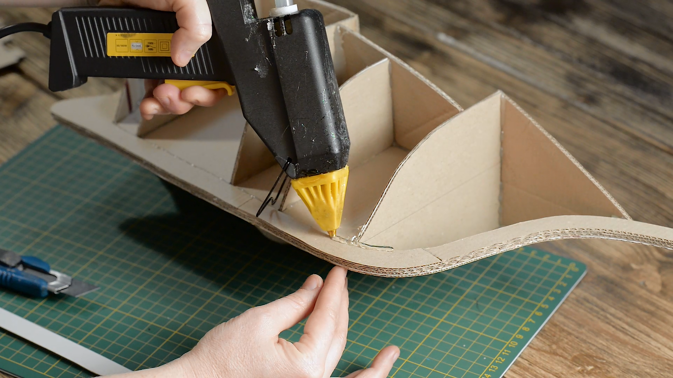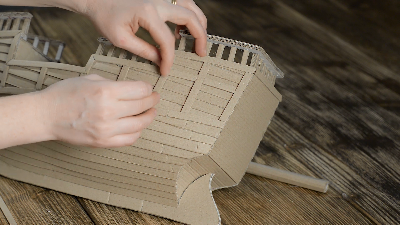 I made some long 15 mm stripes of the same 2 mm pizza boxes cardboard and started gluing them to the framework. I started from the bottom of the ship and worked my way up. I overlaid each piece over the one before just a little bit.