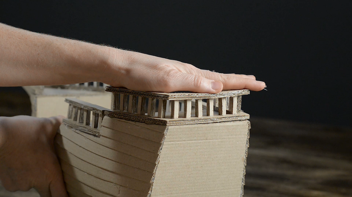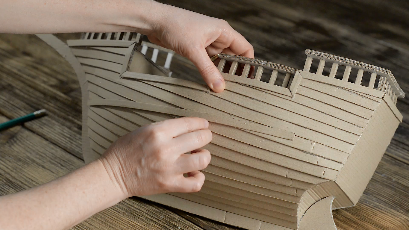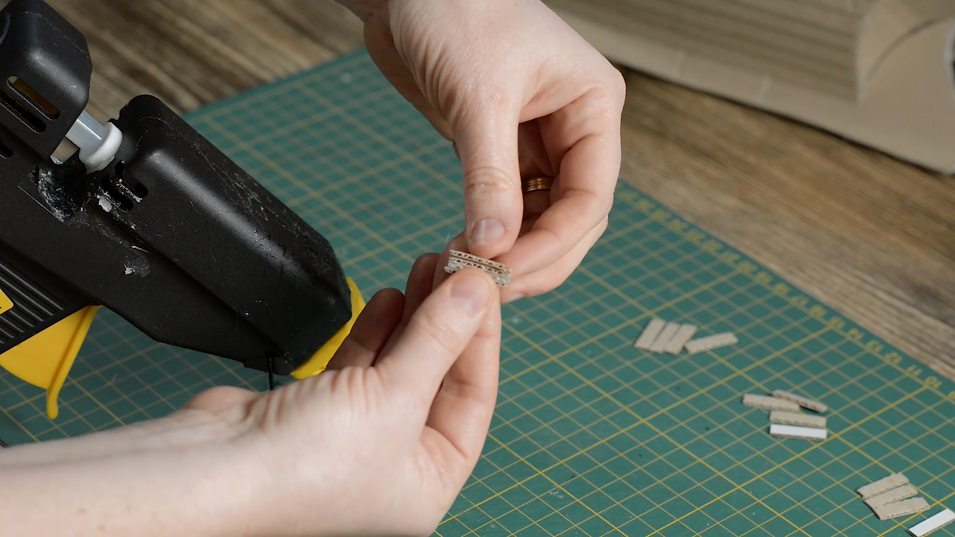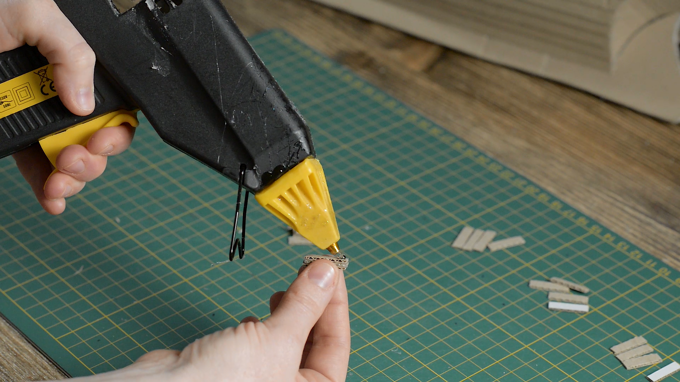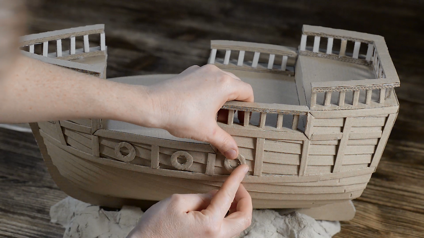 I added some details using thin stripes of cardboard on the sides. Although these details are not so visible now, they will look great when making the patina. I also added some round and square windows.