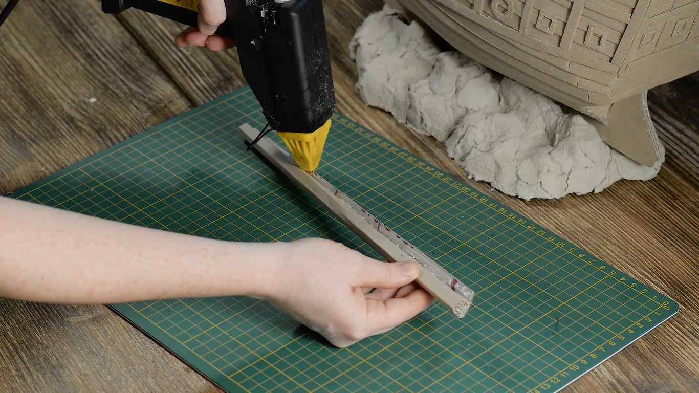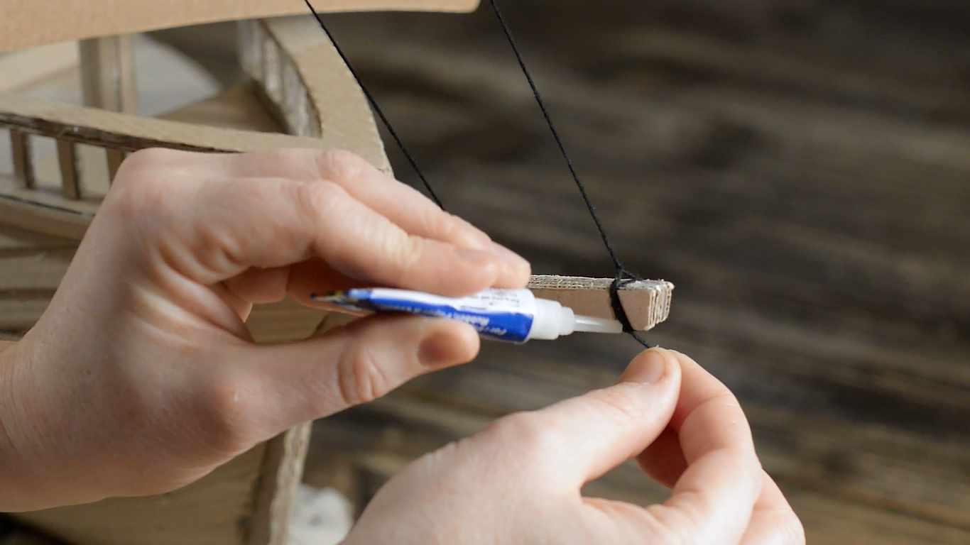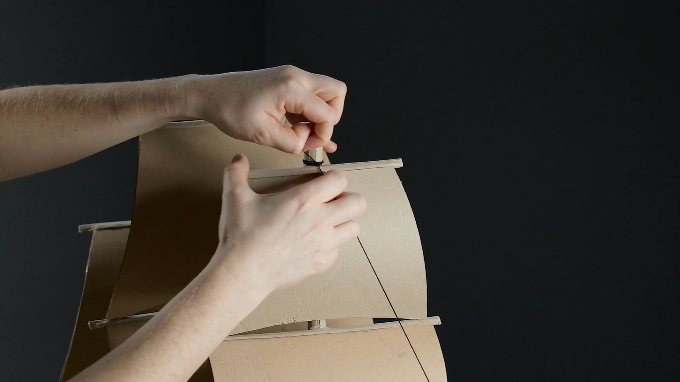 I made the main three pillars by rolling and gluing the cardboard until I reached the desired thickness. One pillar is about 20 mm thick. The middle one is the tallest and it has 360 mm, the one in front has 320 mm and the last one has 220 mm. I made patterns for the sails also. 1a and 1b are for the front, 2a and 2b are a little larger and are for the middle and 3a is for the third pillar. I made the curved sails by gluing two pieces of cardboard together and bending them while the glue is still hot. I used the cutting mat to help along with the bending. I added threads as best as I could. I am no expert in this so I used some Google images for reference. Even though I had no idea of the correct way this should be done, the threads added a realistic effect to the ship, and this aspect was all that mattered to me. I glued the ends of the threads using super glue.