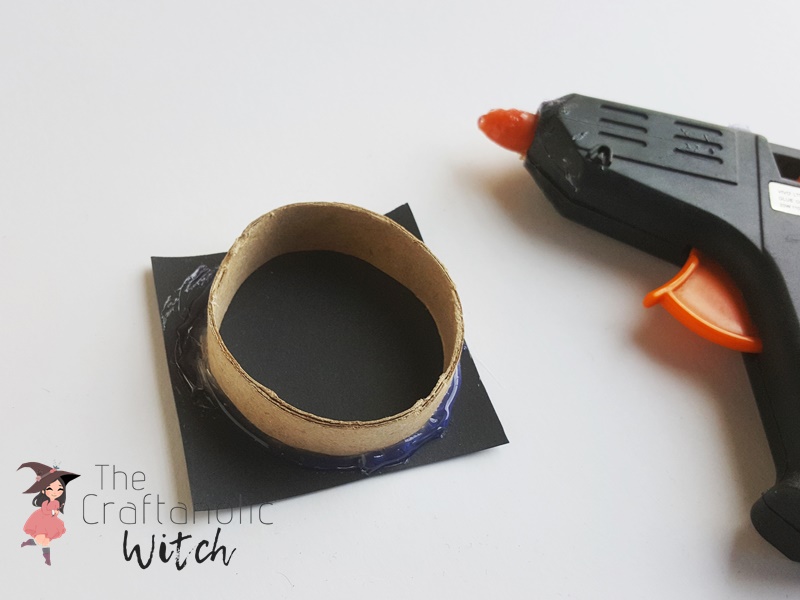Prepare the hot glue gun and use it to attach both pieces (the cardstock paper and the tissue paper roll cutout) together.