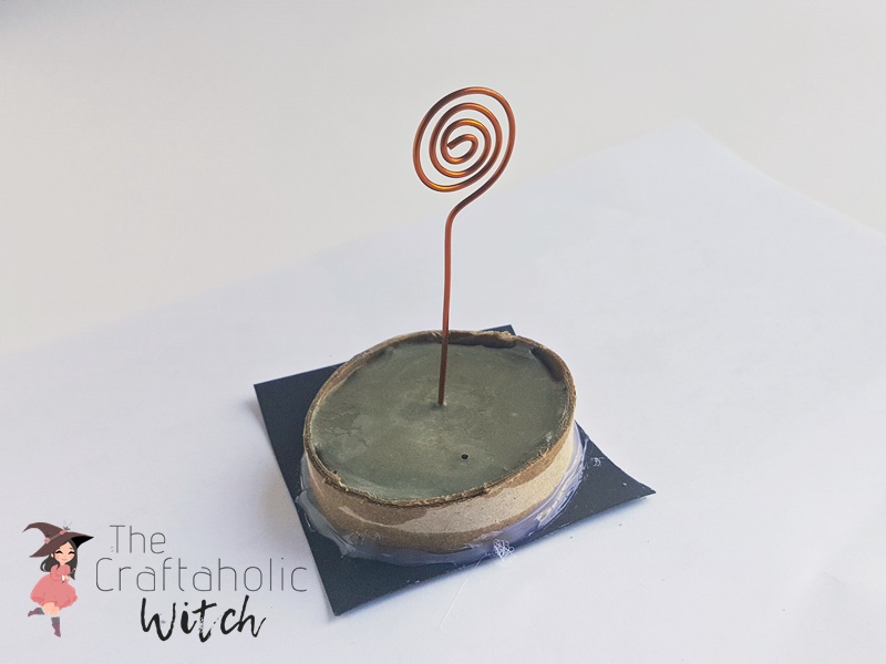 Take the wire stand prepared in step 5 and place the square part inside the cement of the primary container. Gently push the wire stand inside the cement mixture until it reaches the bottom.