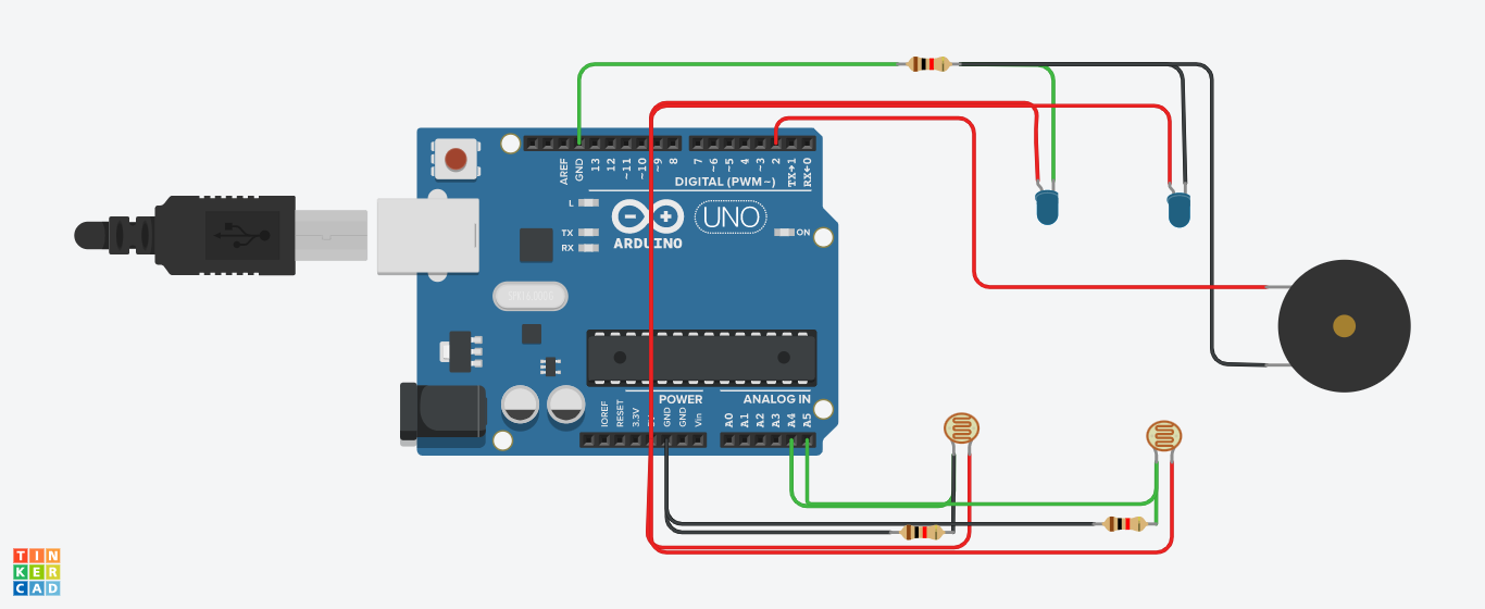 Add the LED, Resistor, Photoresistor, and Piezo then wire it up. It will be a little tricky so watch the image carefully or watch the video.