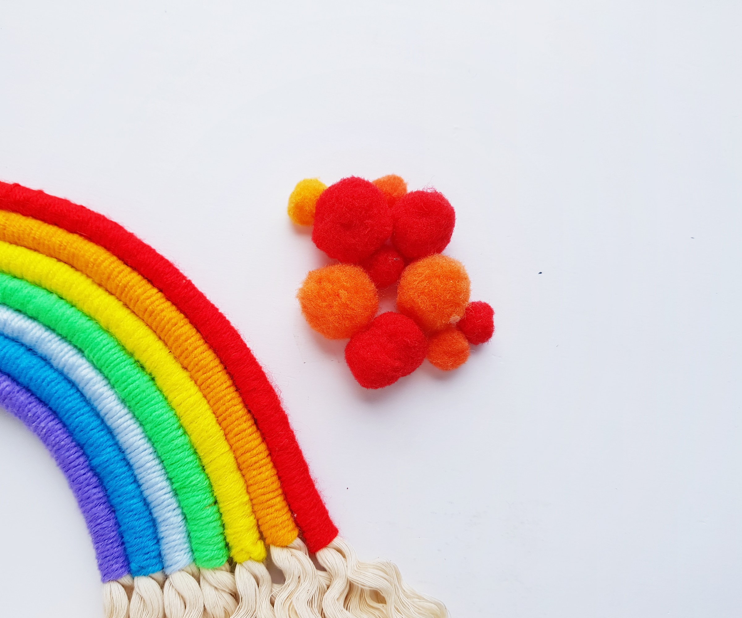 Grab some pompoms and attach them along the top side of the rope rainbow pattern. Attach the pompoms however you want, you can fill the whole top side or keep even gaps between them pompoms, however you like it to be.