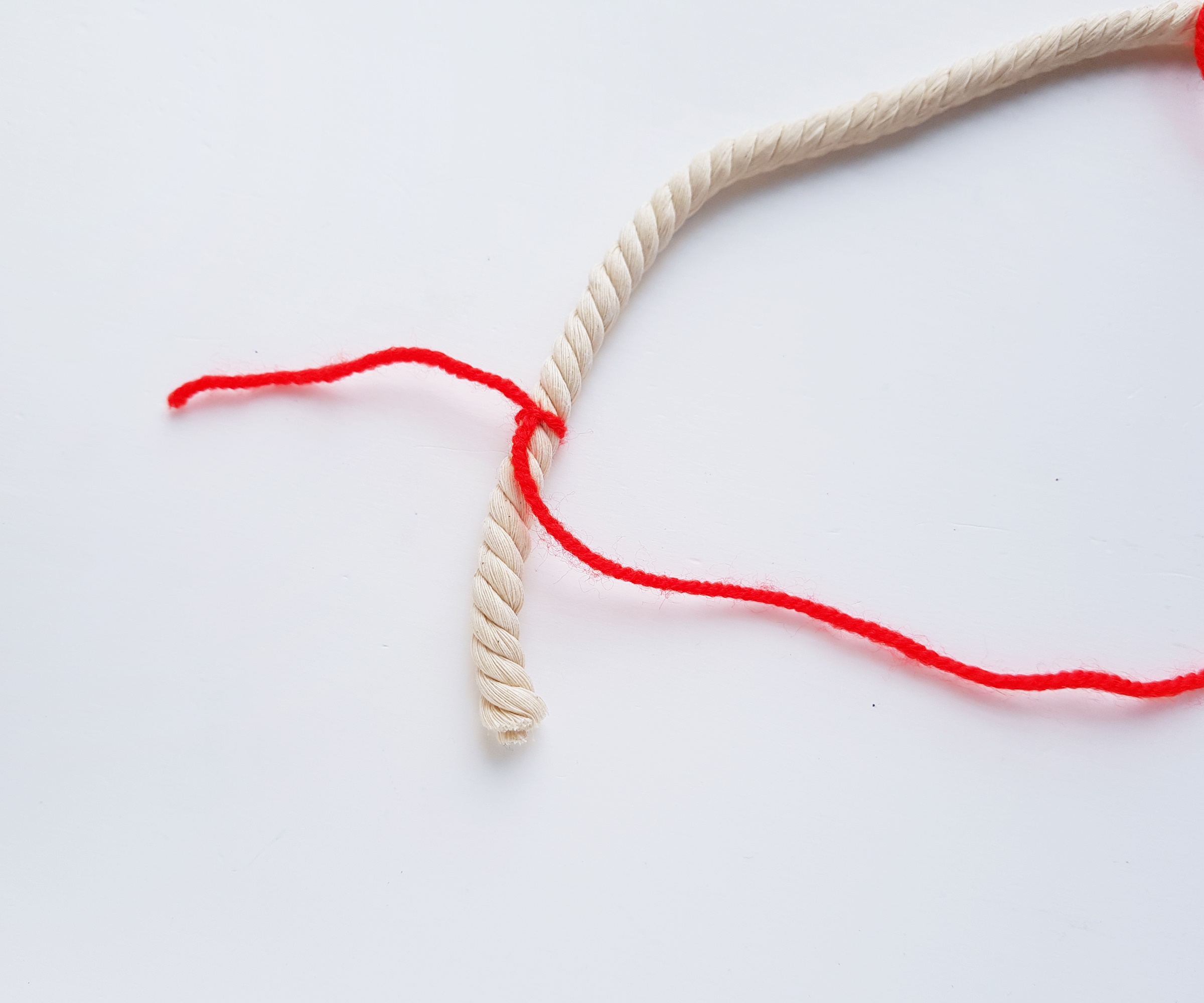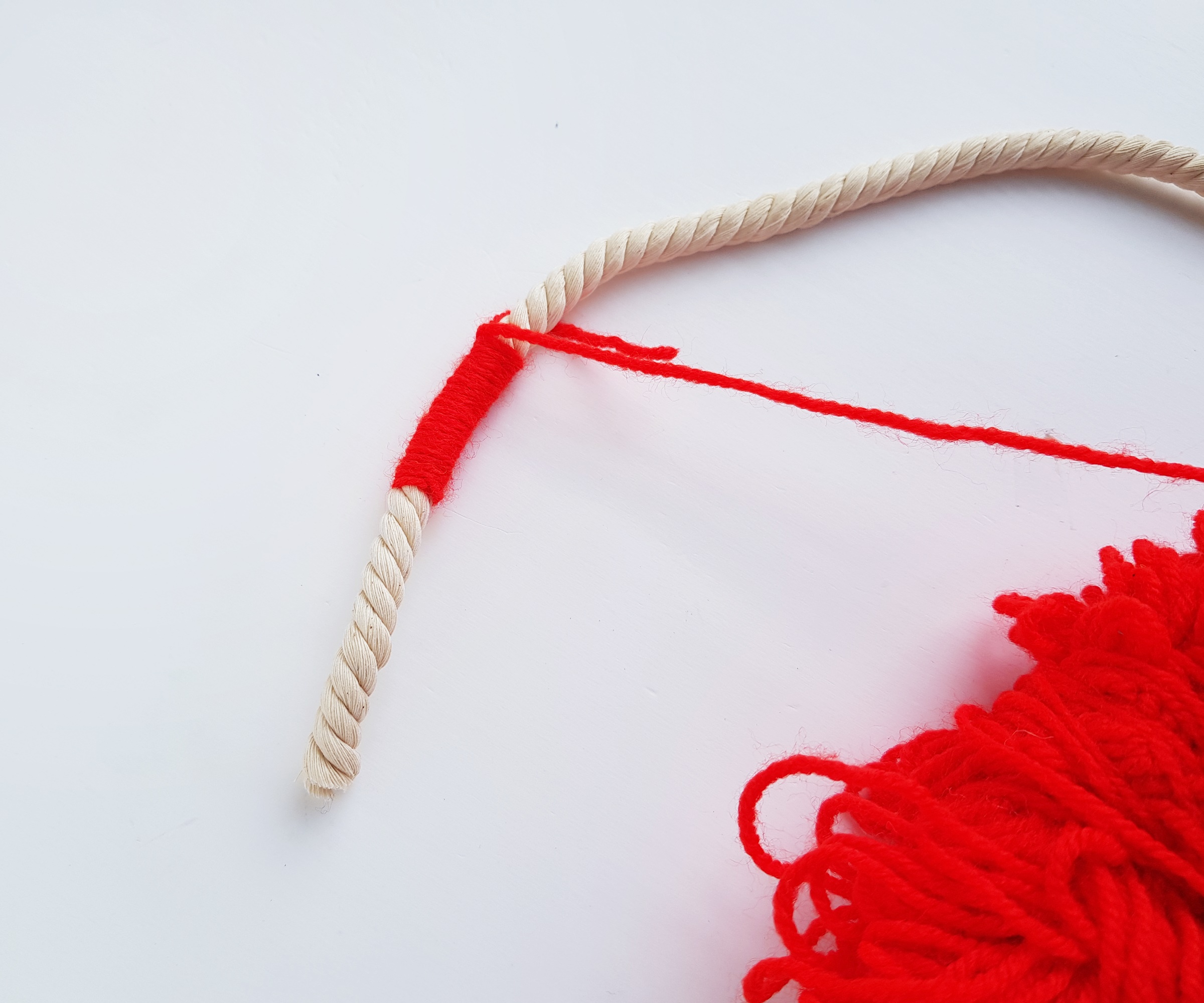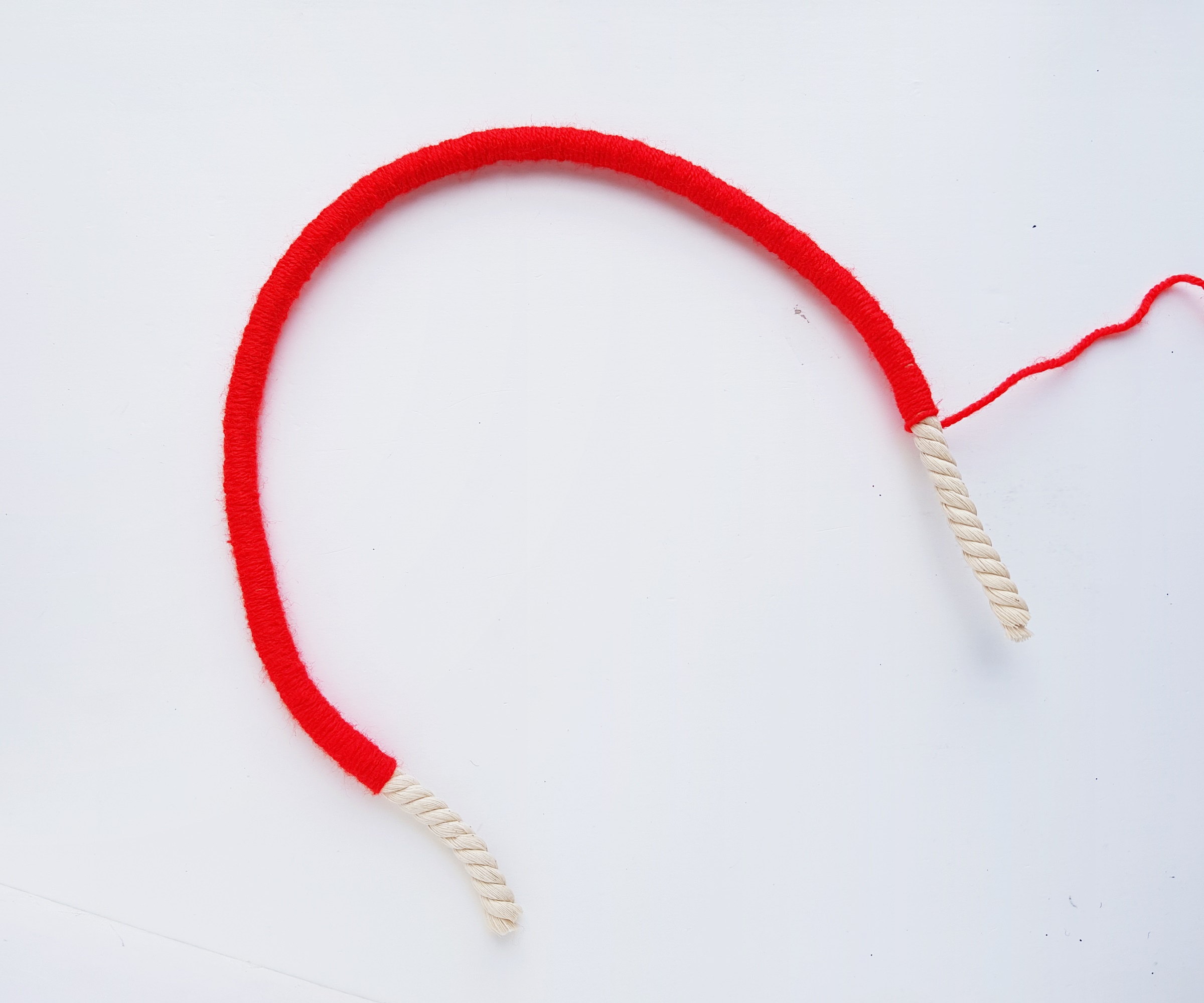 Time to wrap the cut-out rope strands with yarns. I’m starting with the longest rope strand. I'm using red yarn to wrap the longest strand. I'll be using a rainbow color scheme for this one.