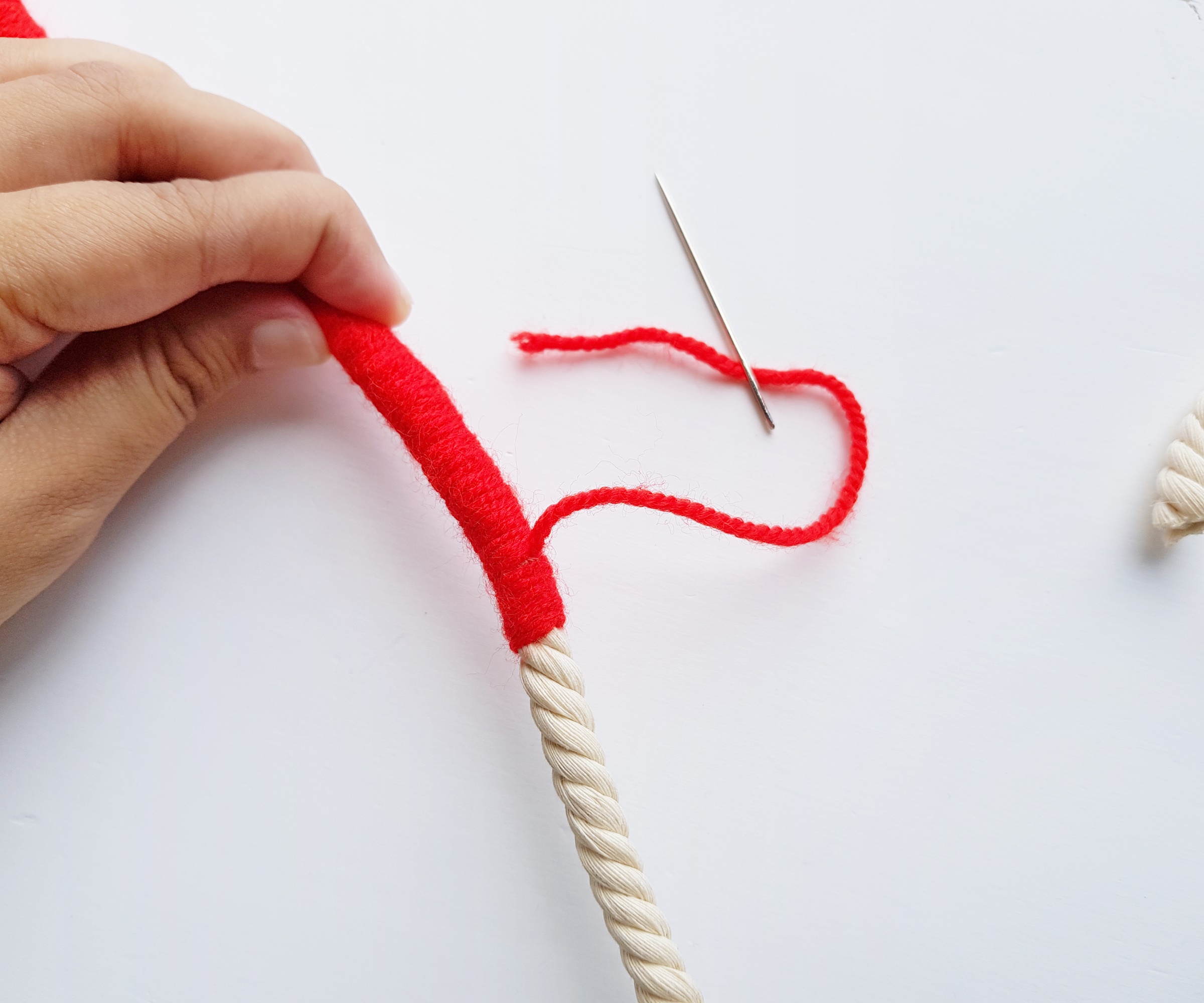 After tying a knot, a small length of yarn should remain, align that small yarn part with the rope and start to wrap the yarn around it as well. Wrap the yarn around the rope and try not to leave any gap between the wrappings.