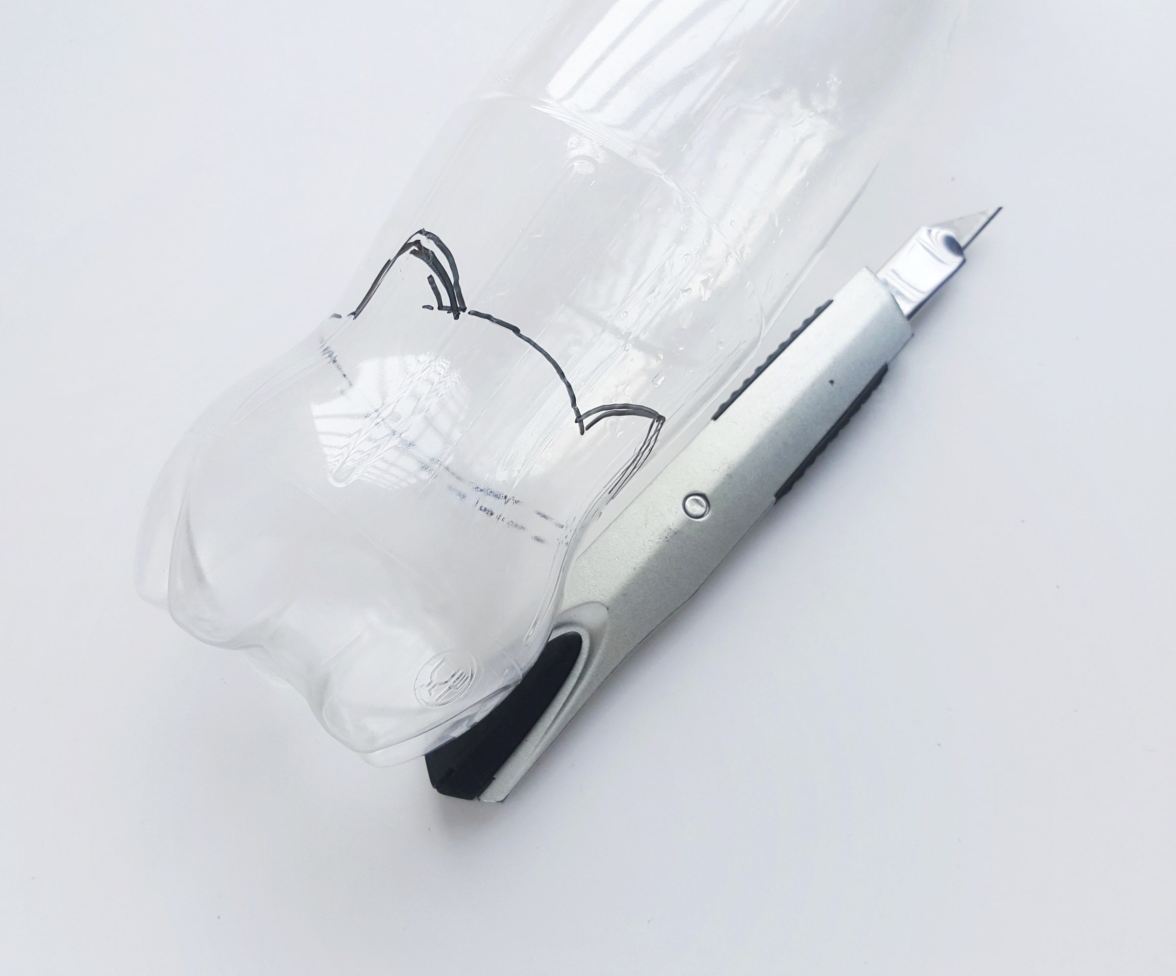 Use an x-acto knife to cutout the traced pattern from the plastic bottle. Place the bottle on a flat surface and hold it tightly with one hand, while pressing the pointy edge of the knife against any point of the traced line with the other hand.