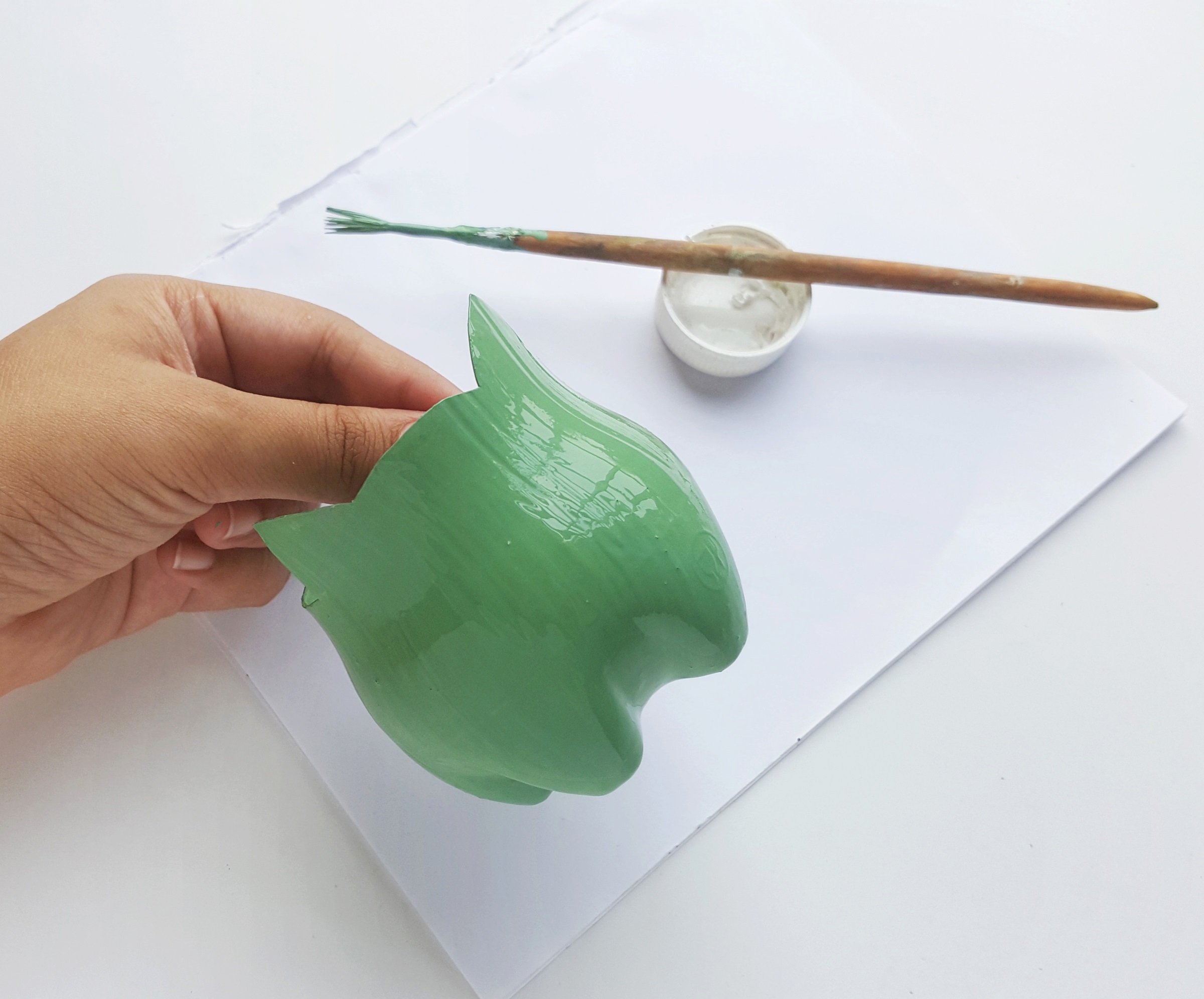 Prepare paint to match the color of Bulbasaur. I mixed white, blue and green. Keep adding and mixing colors until you’re satisfied with the shade. Paint and cover the entire outer surface of the cutout bottle pattern. Once the painting is done allow the painting to dry.