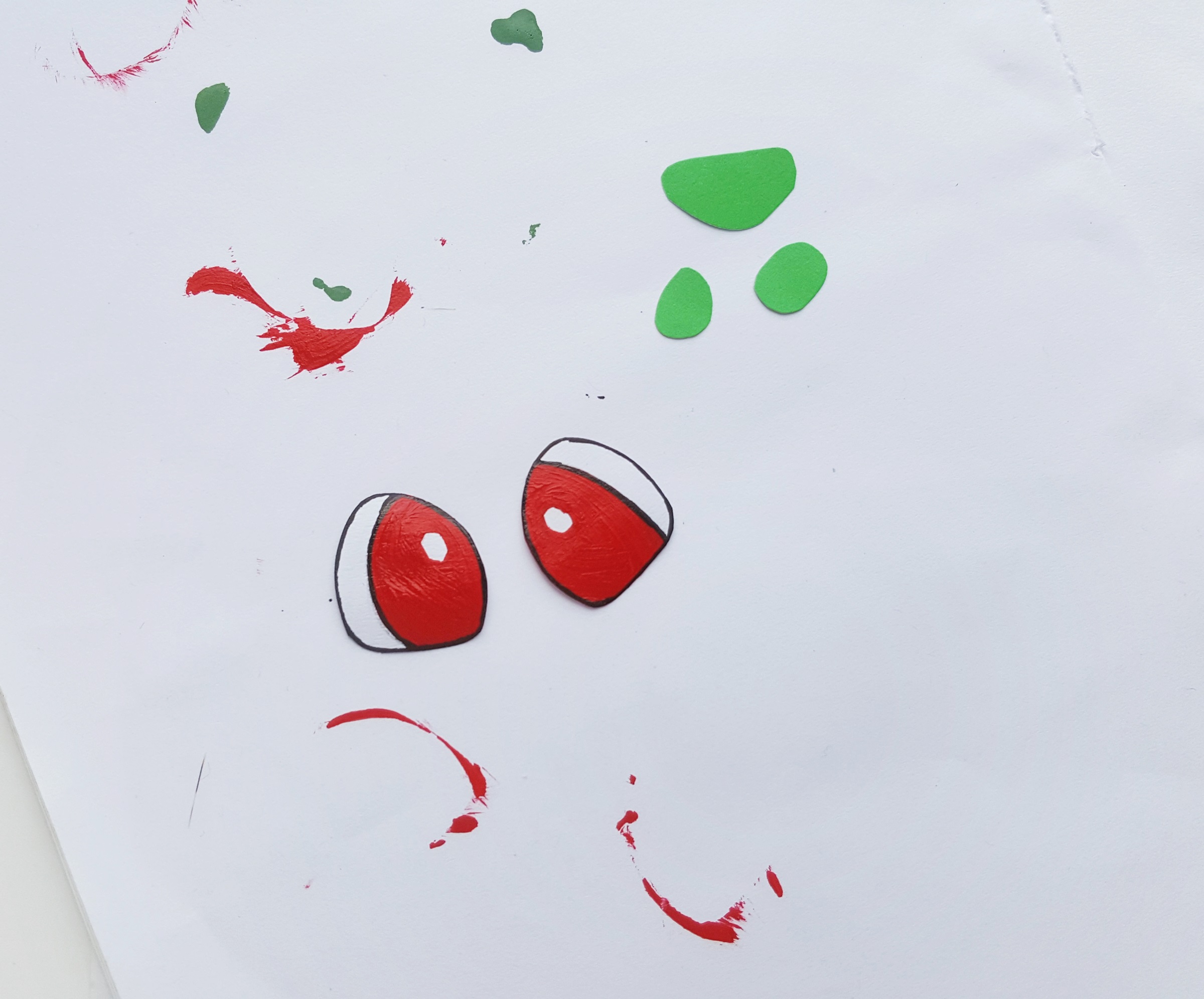 Similarly draw and paint the eyes on white paper for Bulbasaur. Allow the paint to dry completely. Also, cut out 3 random pattern from green craft paper for the patterns on Bulbasaur's head.