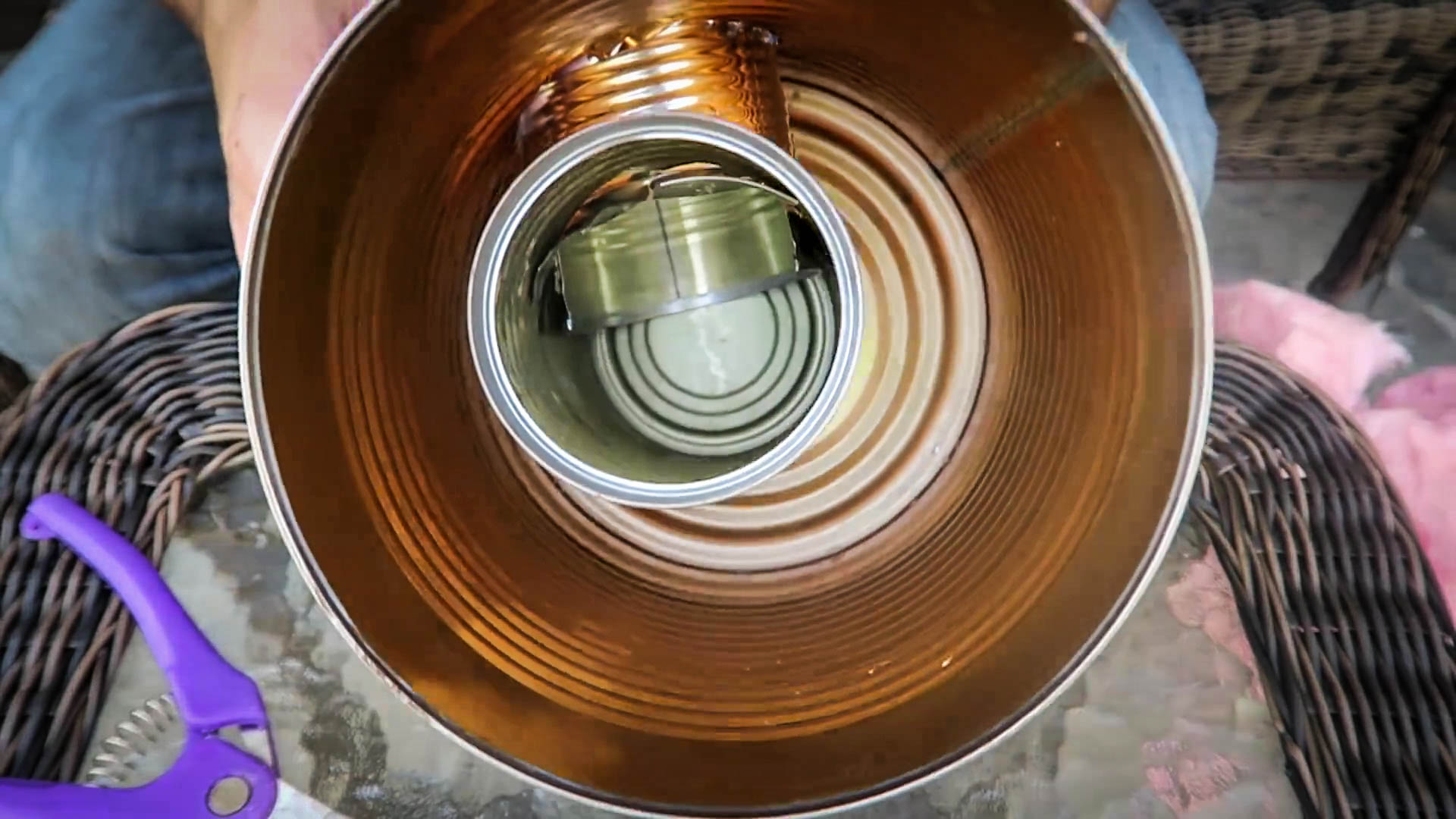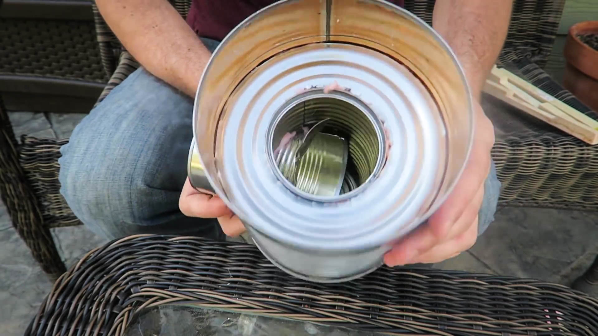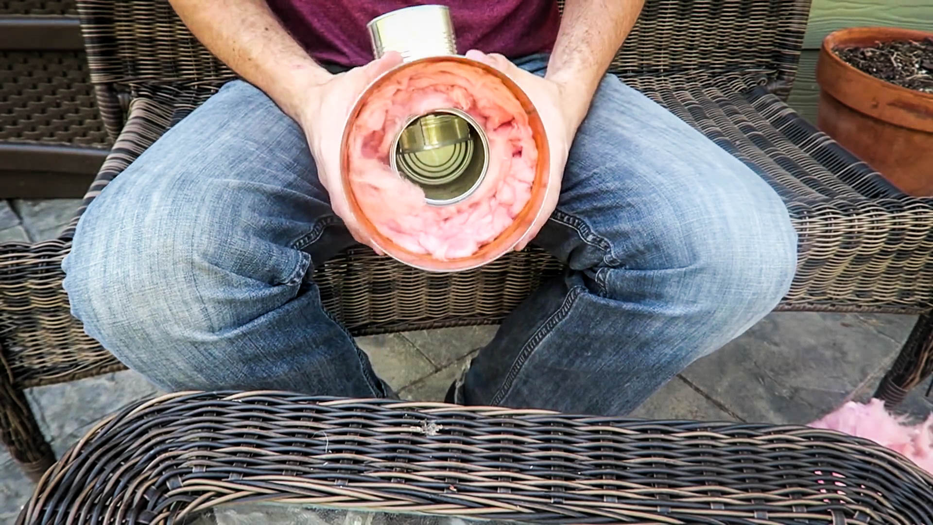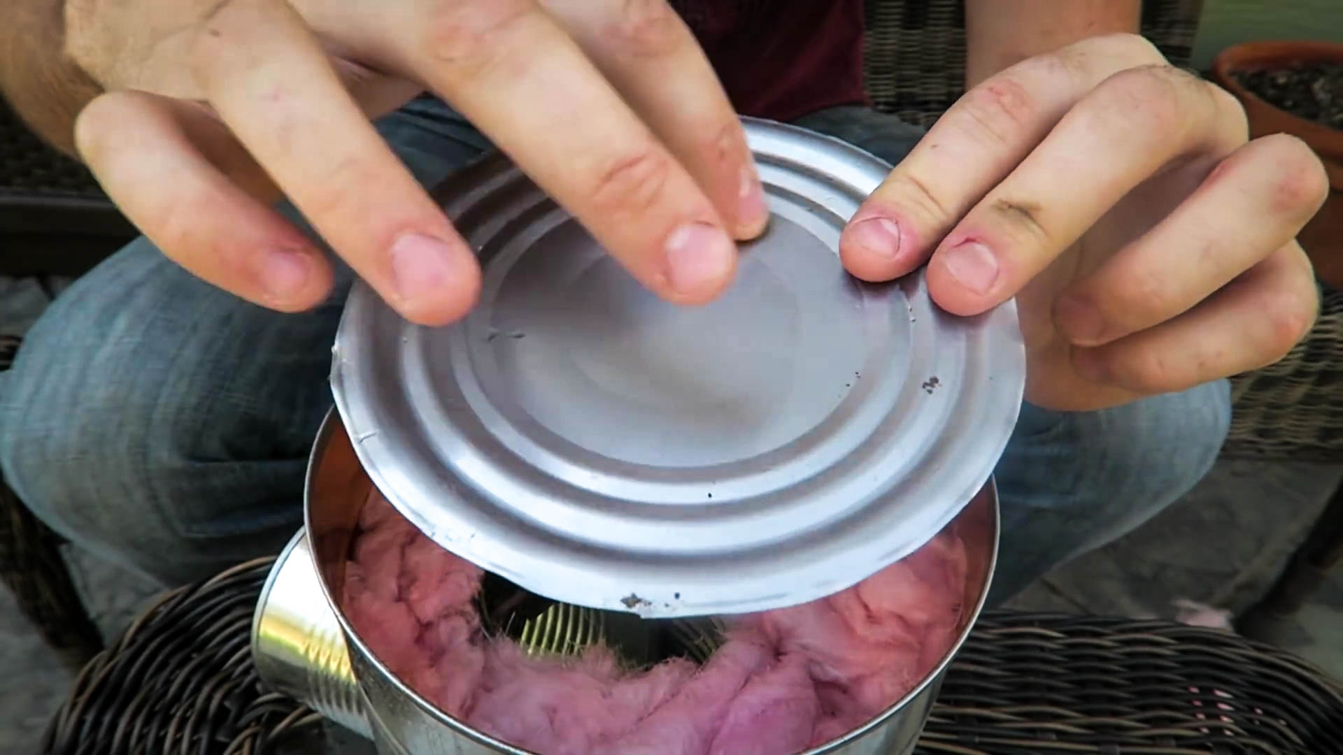 Then we're going to get insulation and stuff it in between of these jars. You could use sand or maybe rocks, but it will make it heavy. The insulation, it makes it very light. Okay, then we're gonna take this, remember the top that we cut off, we wanna save it, and then we gonna make a hole the size of this jar. Then what we're going to do, get this thing and put it right in the hole ... oh wow! Look at that. It works so well I'm surprised in myself how well it's turning out.