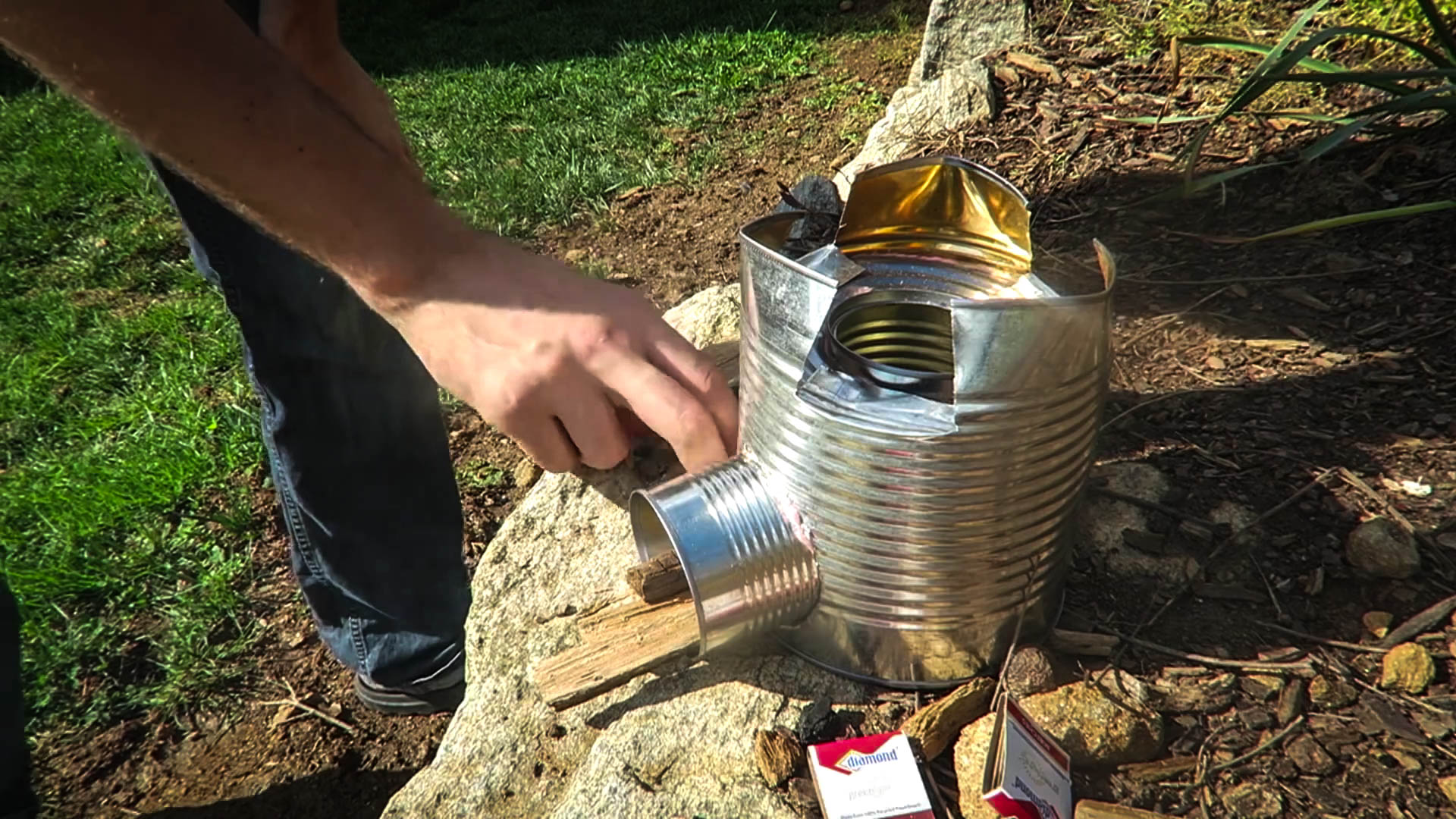 Once the fire is going well, you can put bigger and bigger sticks in there, so that way you can keep it going, and they can stick out like that, on the outside. So that way you can just push them in a little bit further, when you have to, but you don't wanna block the entrance here too much, so don't stuff it too much. And this is how you're going to put the part on boom, just like that. And is going to keep burning. So this what the flame is going to go through to the sides and get the pan really hot and very easily. So this is how you make a rocket stove out of cans.
