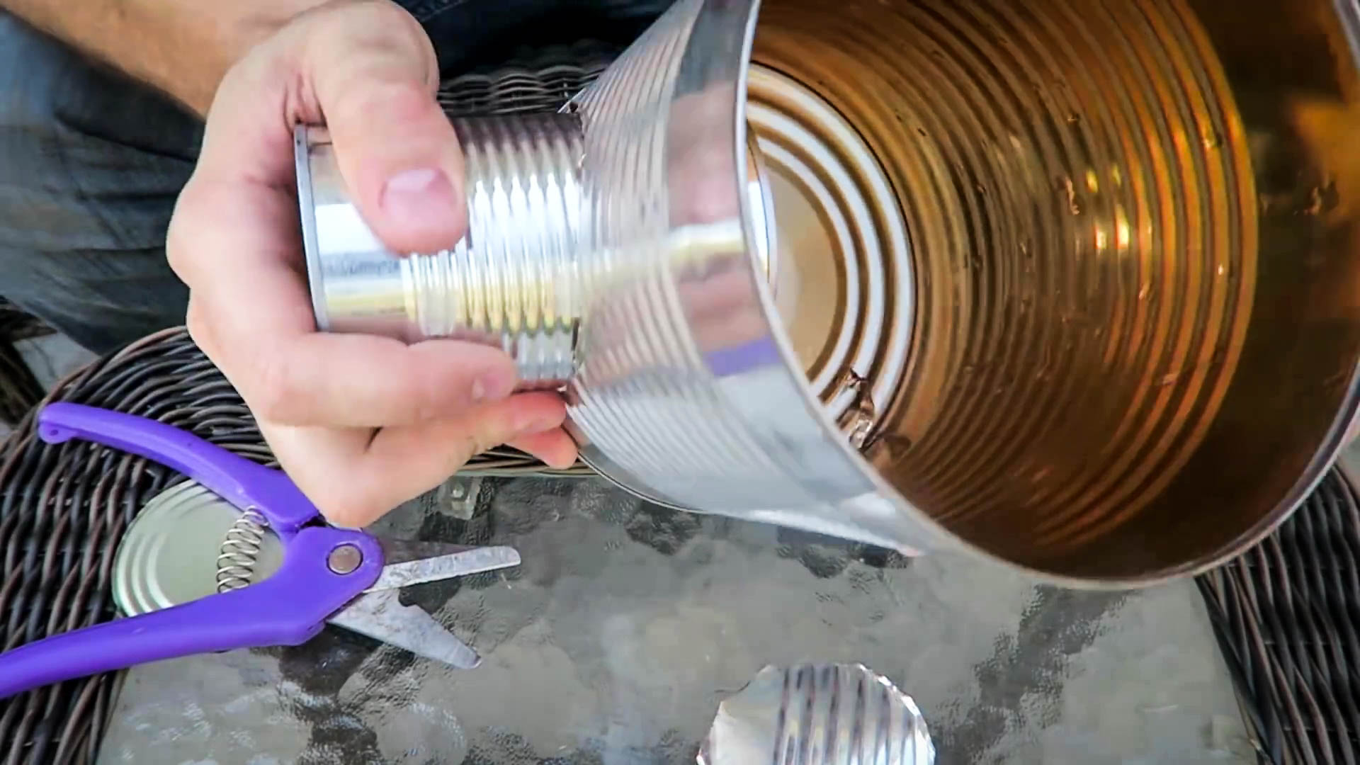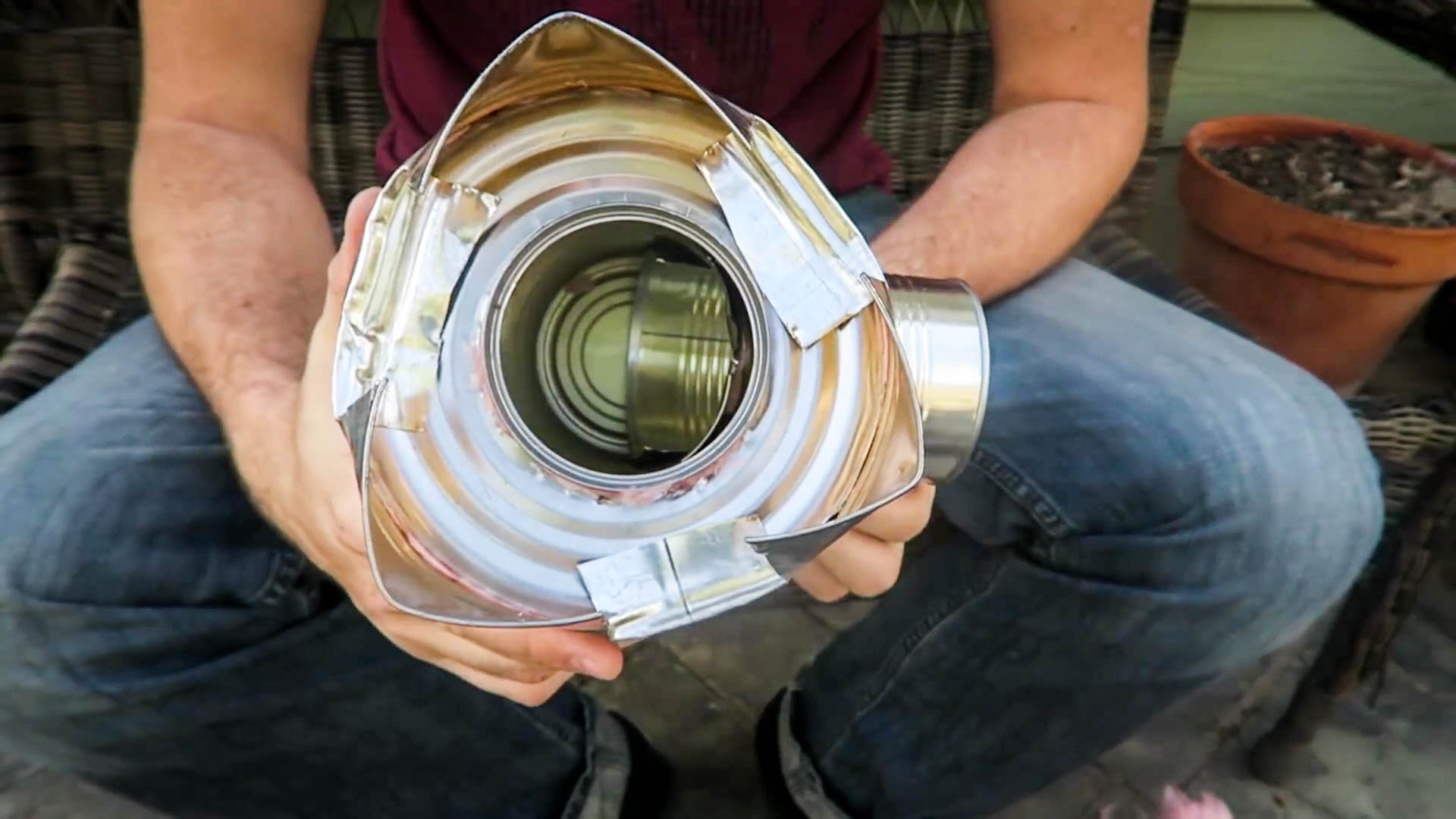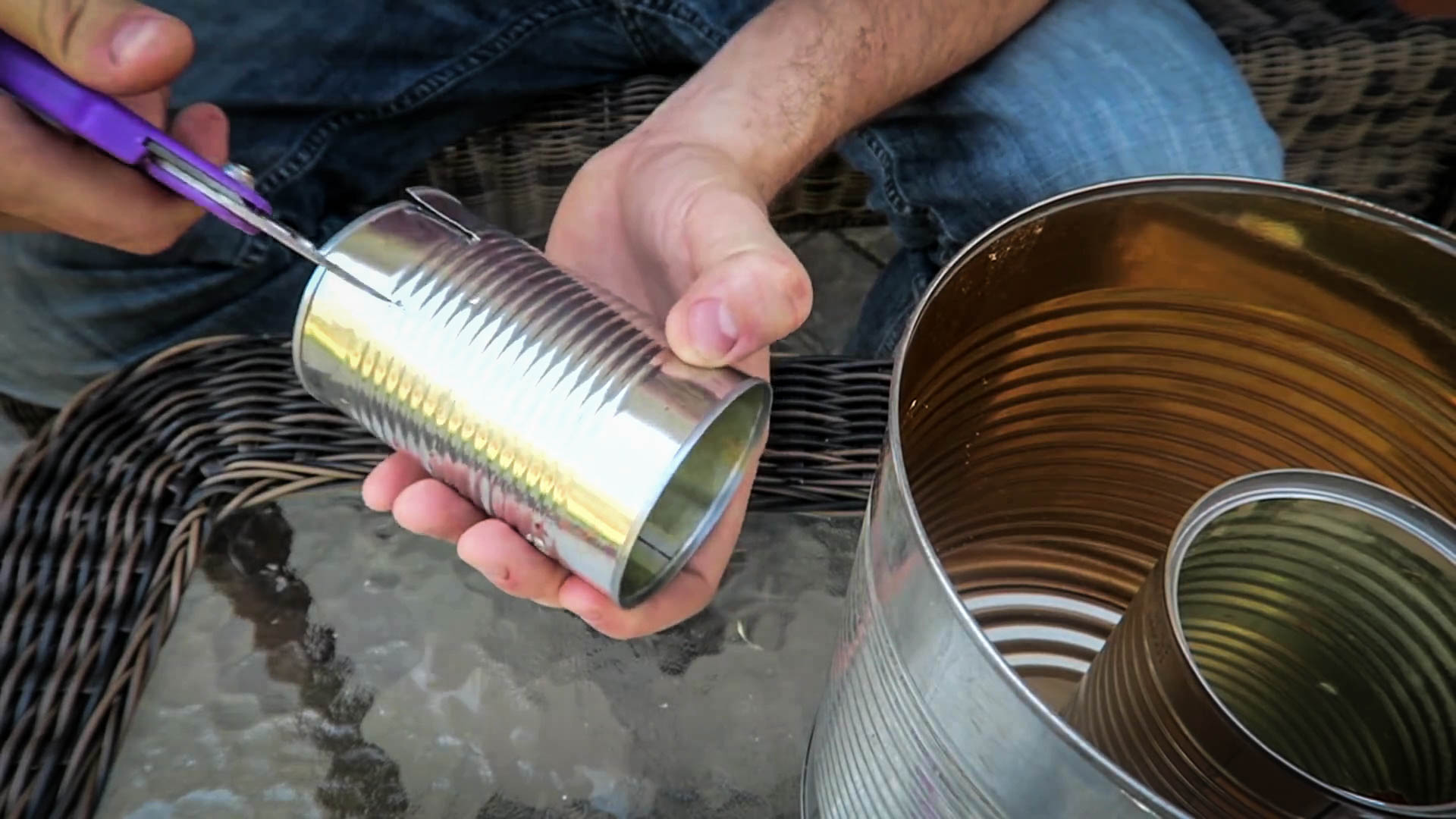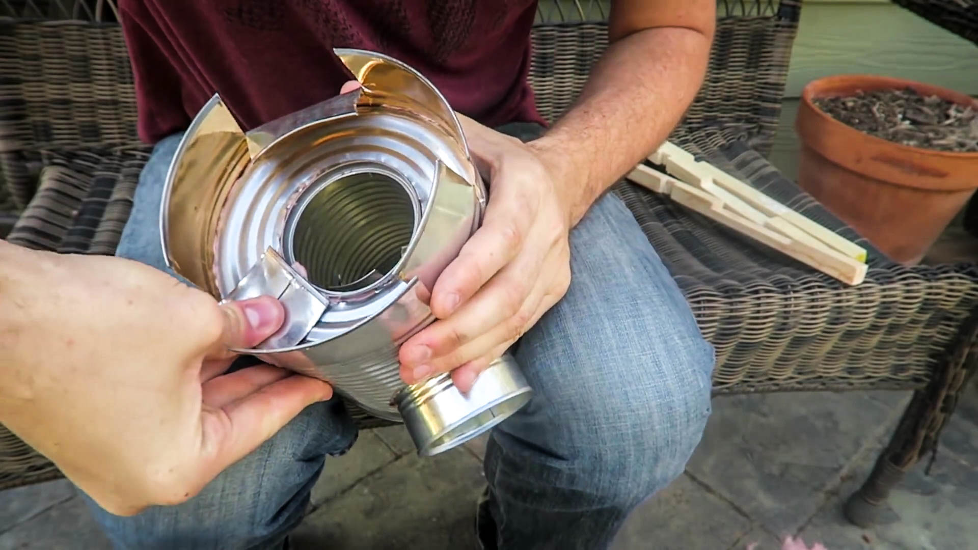 Next what I'm gonna do is cut it down this way. I need better tools, and we're going to cut it in a few places. Now you see how I cut off like this, one two three four five six, and we're going to bend it down this way. All right, this is what it's going to look like. There's air going to through here, see my hand is right here. We're going to load the sticks inside of here. Fire is gonna come out here and all the air is going to come in inside here. That's why it's called the rocket stove.