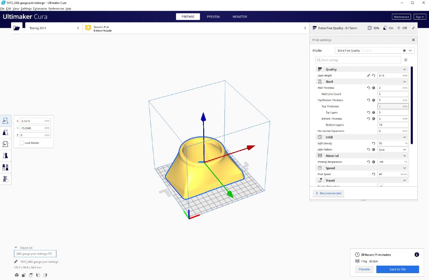 I used a Tronxy X1 printer with black PLA filament. The bed side is 150mmx150mm minimum for this print. The photo attached shows my CURA settings, a 0.15mm layer height resulted in the best print, as I went through multiple test prints and redesigns before this. It took about 16 hours for the print to complete. Be sure to use supports set at a 45 degree angle minimum for structure.
