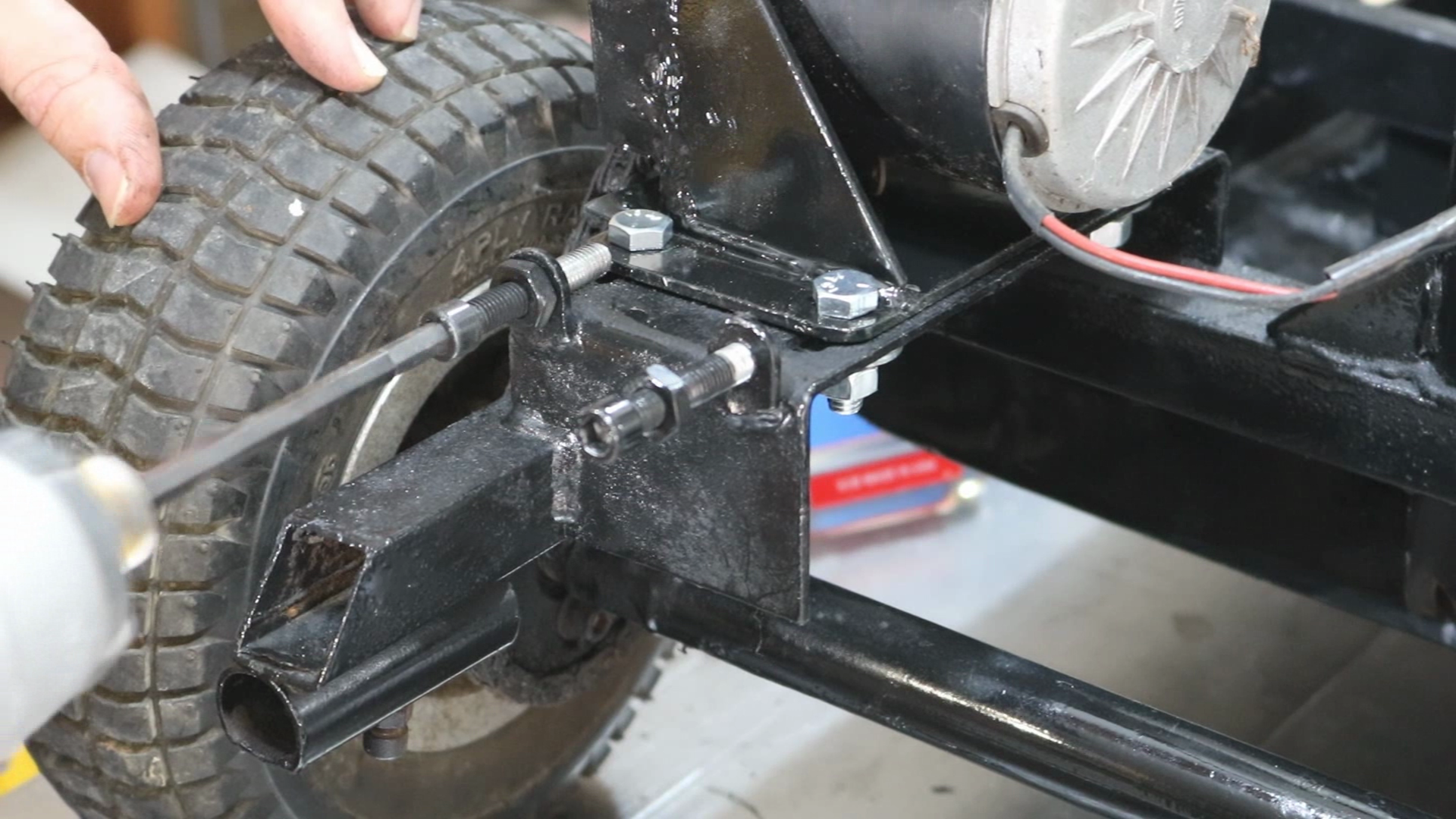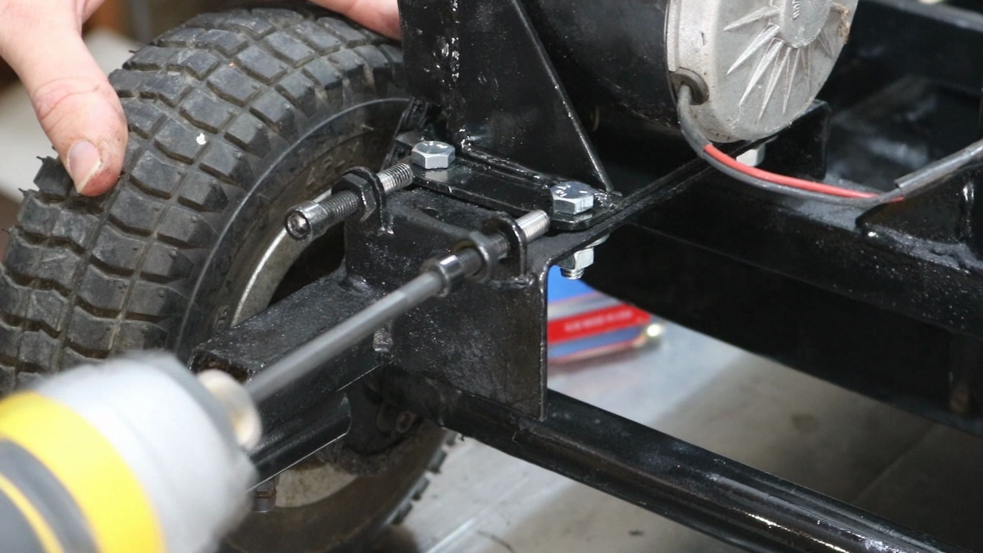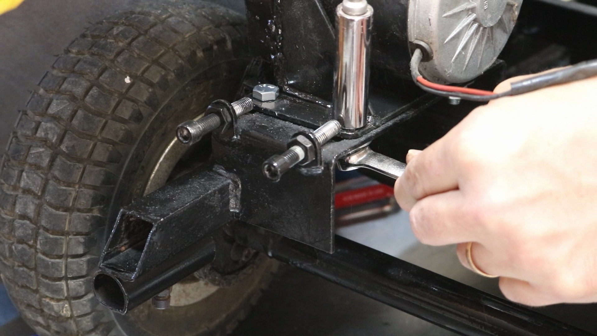 The motor get mounted to the rear left wheel area. It is held on with 4 nuts, bolts, washers, and lock washer. The two hex screws push against the motor mount to apply tension to the chain. The chain need to be put on before anything else.